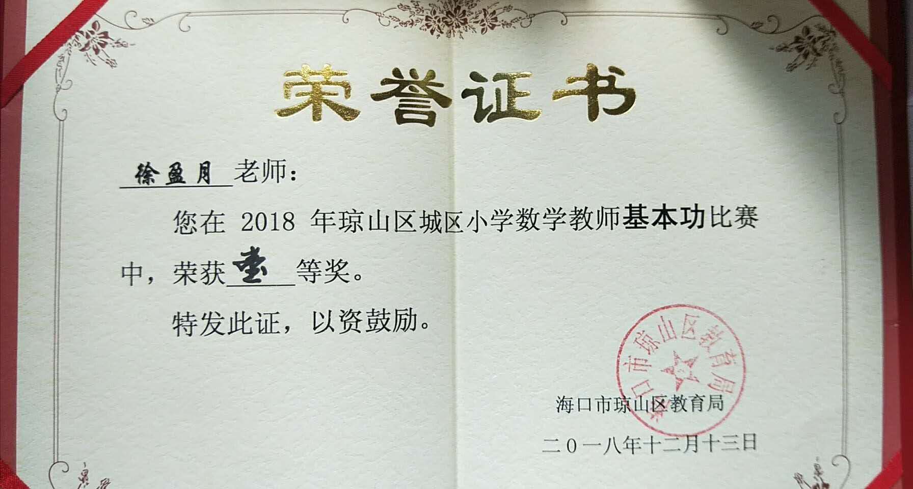 近日,琼山区城区小学数学教师基本功大赛圆满落幕,数理系2018届毕业生徐盈月同学以良好的精神面貌、过硬的专业知识与能力过关斩将,一举摘得大赛一等奖。12月13日,海口市琼山区教育局颁发了荣誉证书。
