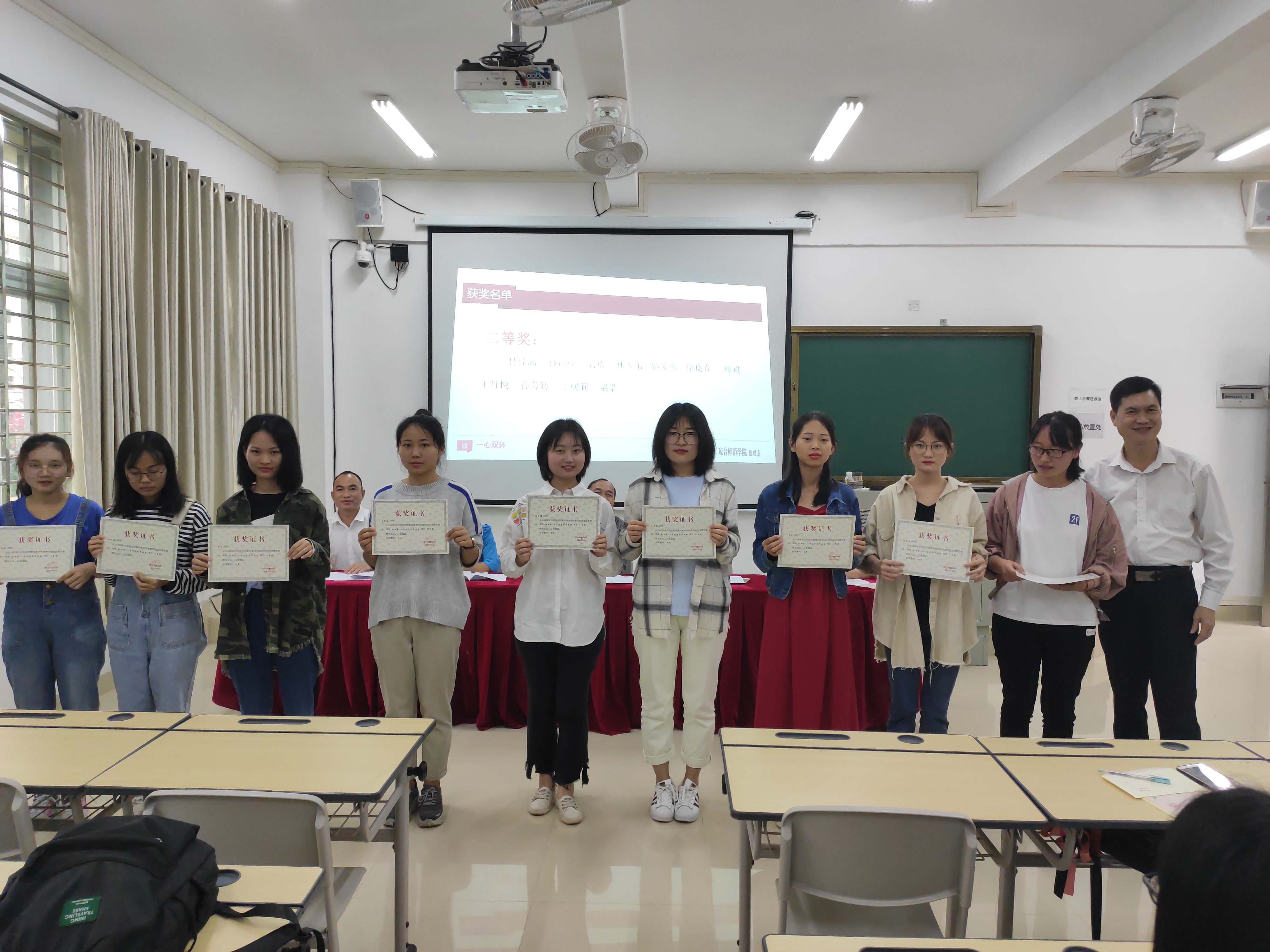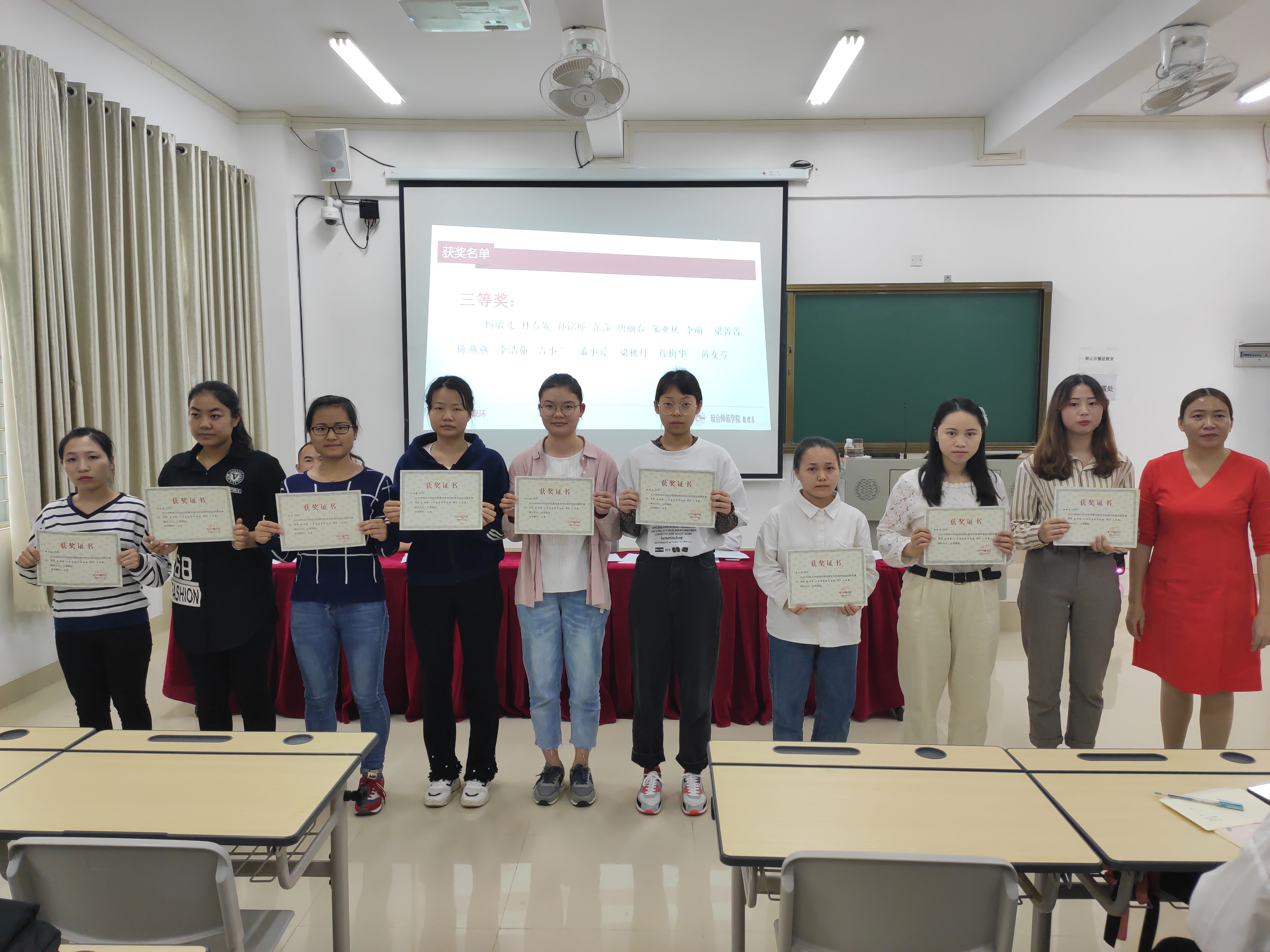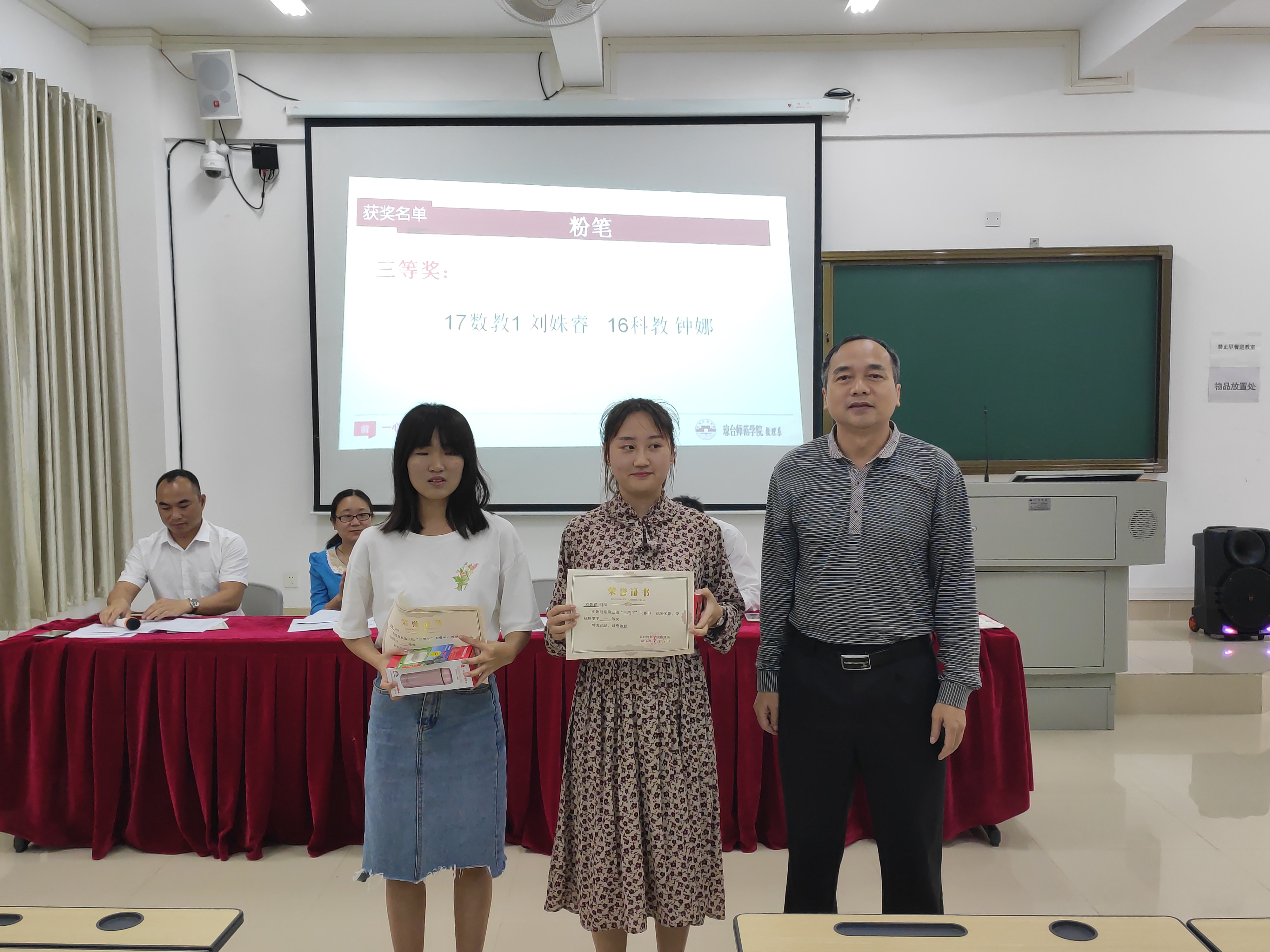 紧接着,在吴老师的引领下进行了颁奖环节。符方健主任、陈明洁书记、文海花老师分别为三笔字大赛和教室技能竞赛中获奖的同学颁奖,并合影留念,颁奖仪式在热烈的氛围中落下帷幕。