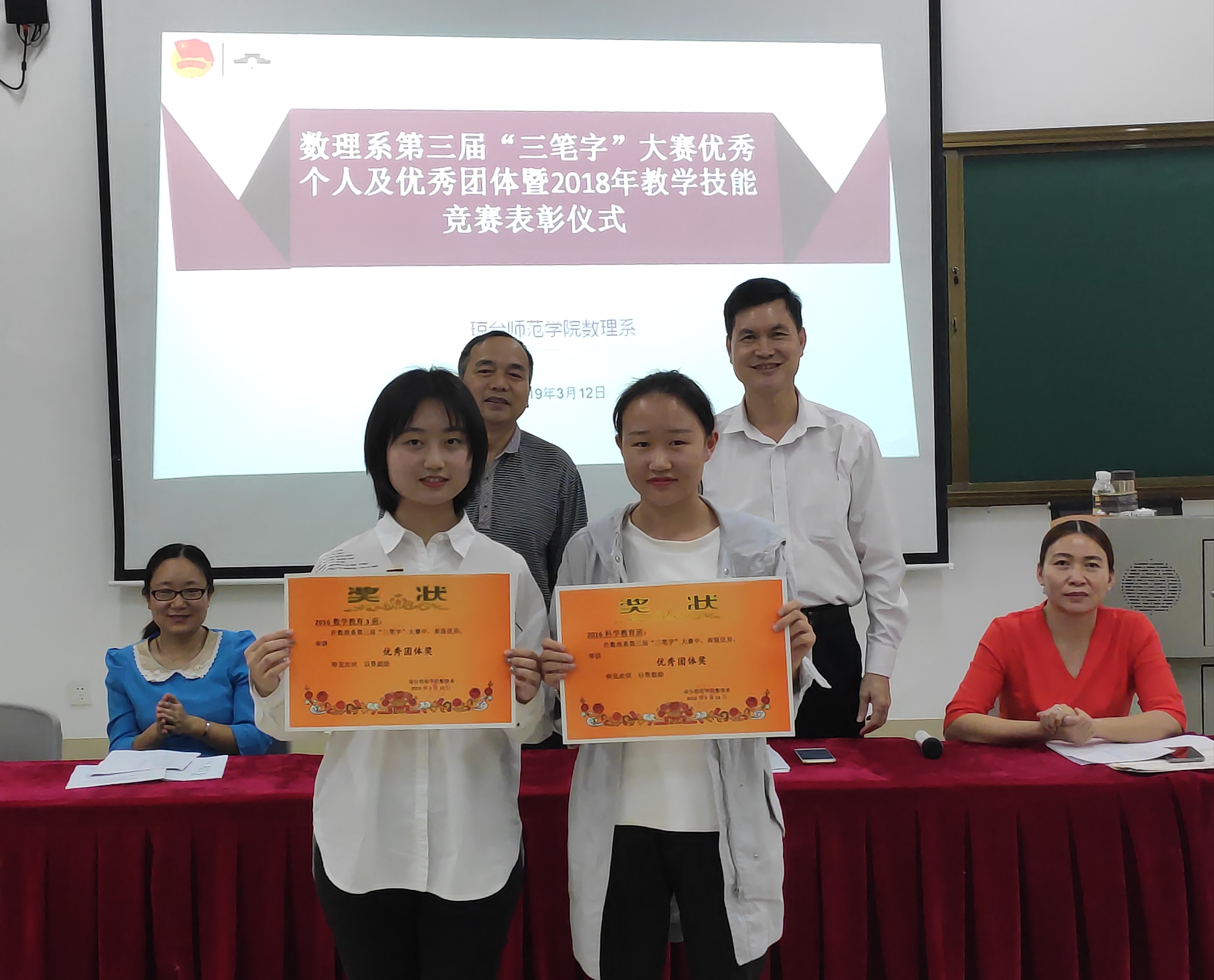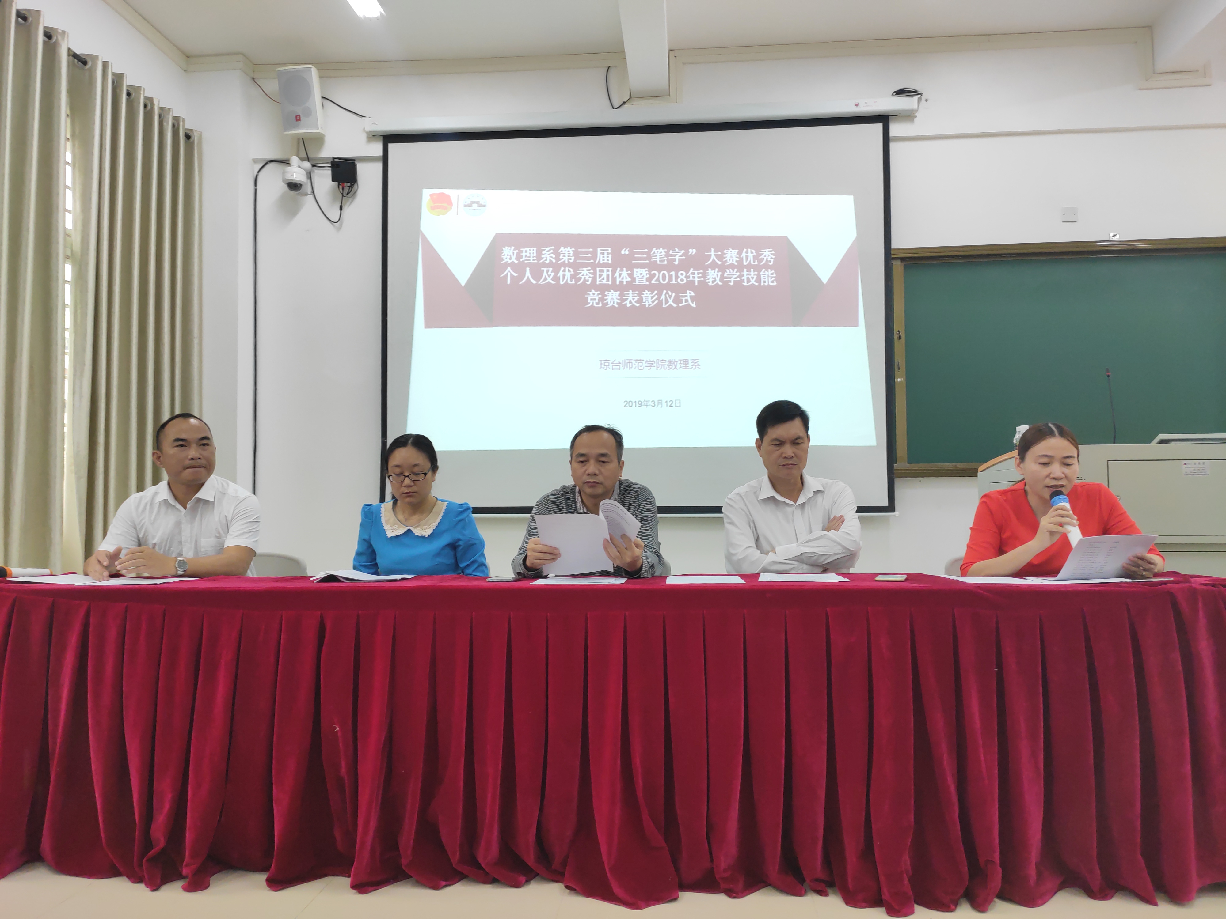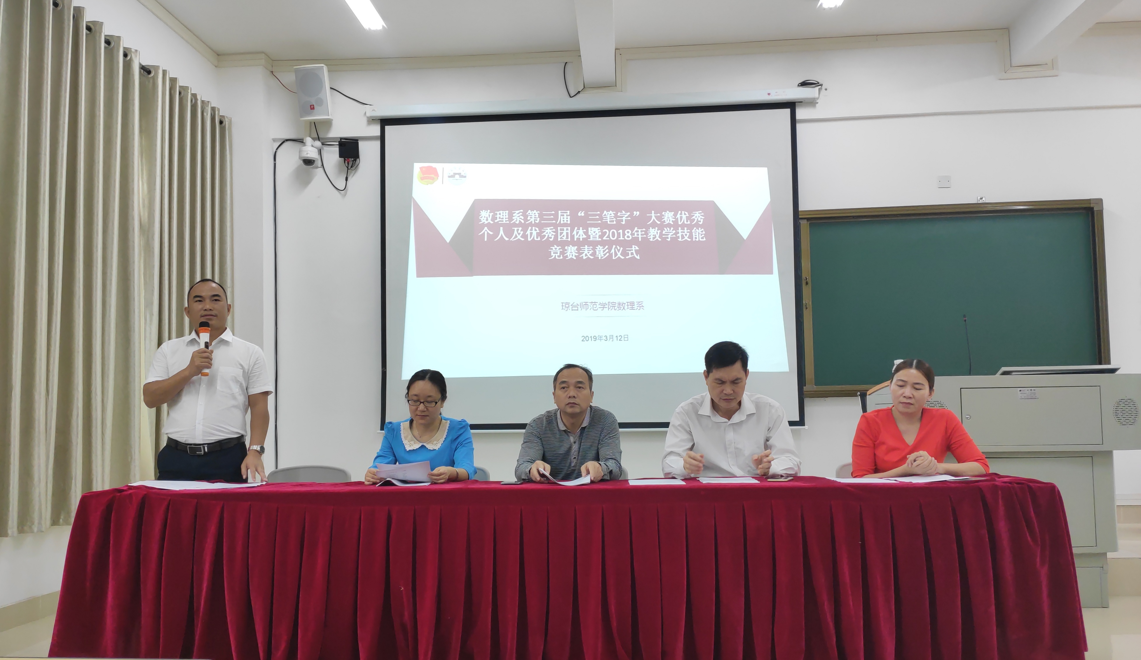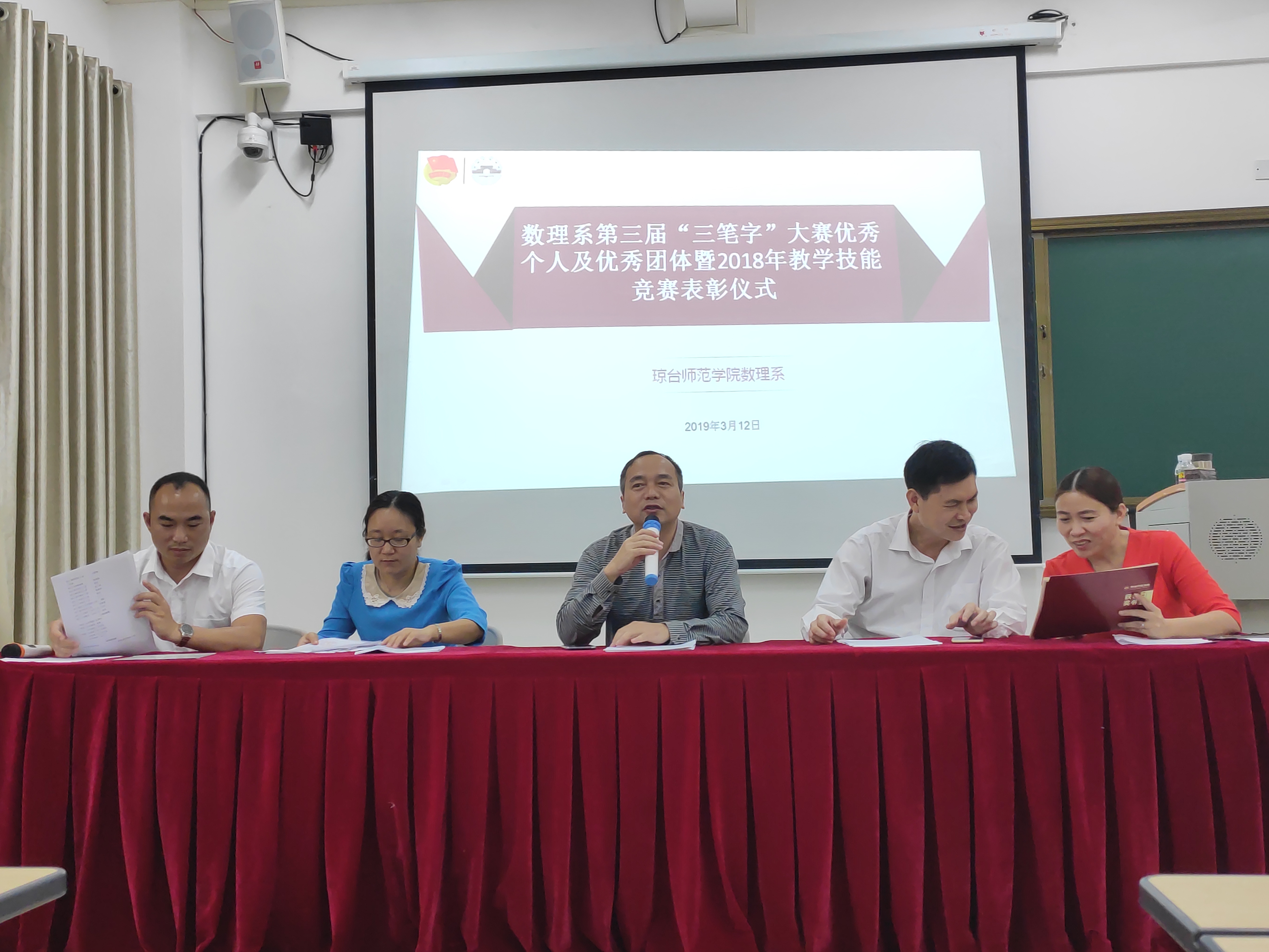 伴随着主持人精彩的开场词,表彰仪式正式拉开帷幕。仪式上,吴钟熙老师简要地介绍了数理系第三届“三笔字”大赛和2018年琼台师范学院数理系教学技能竞赛的组织情况。