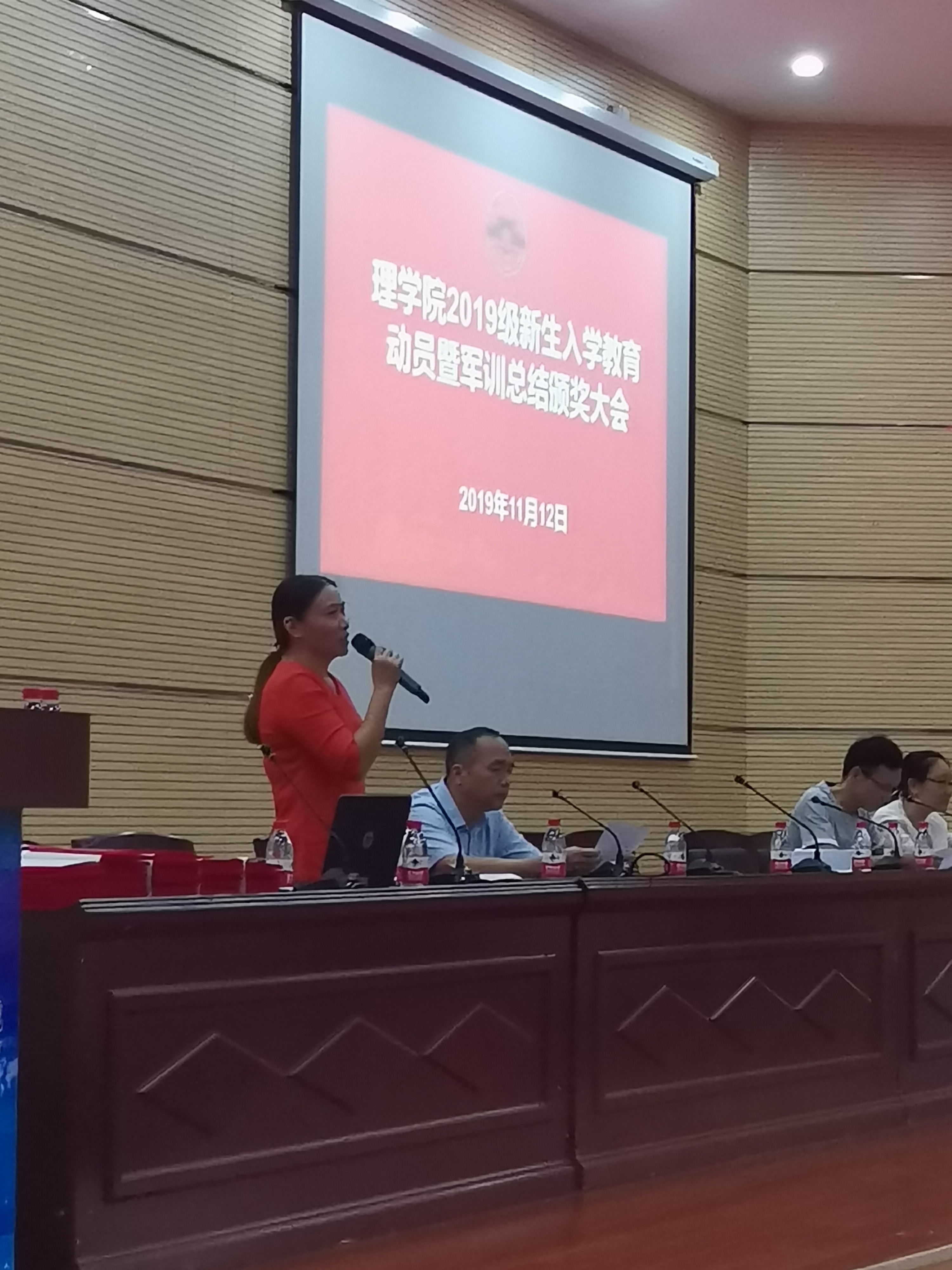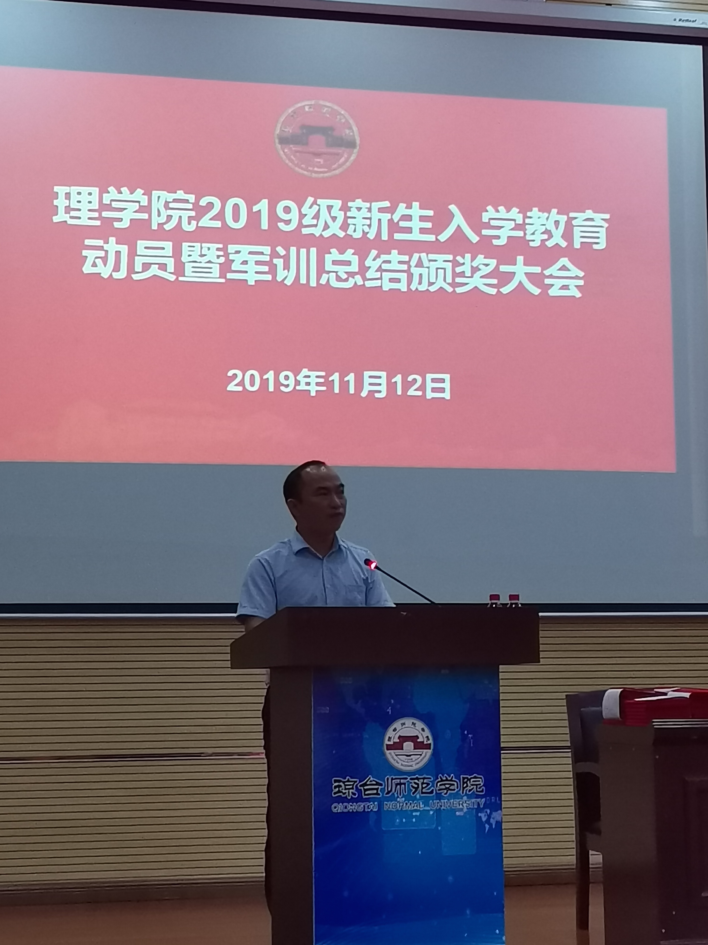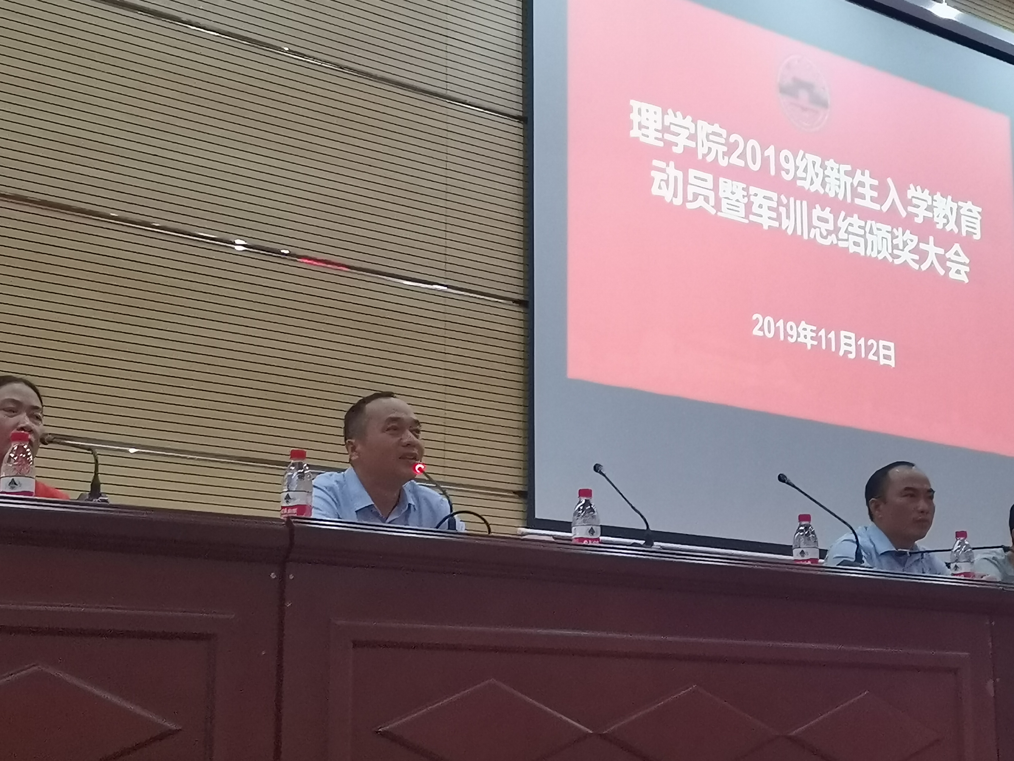 时光荏苒,花落花开又是一季。一张张青春朝气的笑脸,洋溢在校园四下,成为了一道道靓丽的风景线。为使2019级的新生们尽快适应大学校园的生活、学习与工作,同时总结他们在军训期间的表现情况,理学院于2019年11月12日16:00在图书馆报告厅召开了入学教育动员暨军训总结颁奖大会。理学院党政领导符方健主任,党总支陈明洁书记应邀出席了大会,学工办主任文海花老师、团总支书记吴钟熙老师,辅导员申明老师、申琳老师及理学院全体新生参加了大会。会议由文海花老师主持。