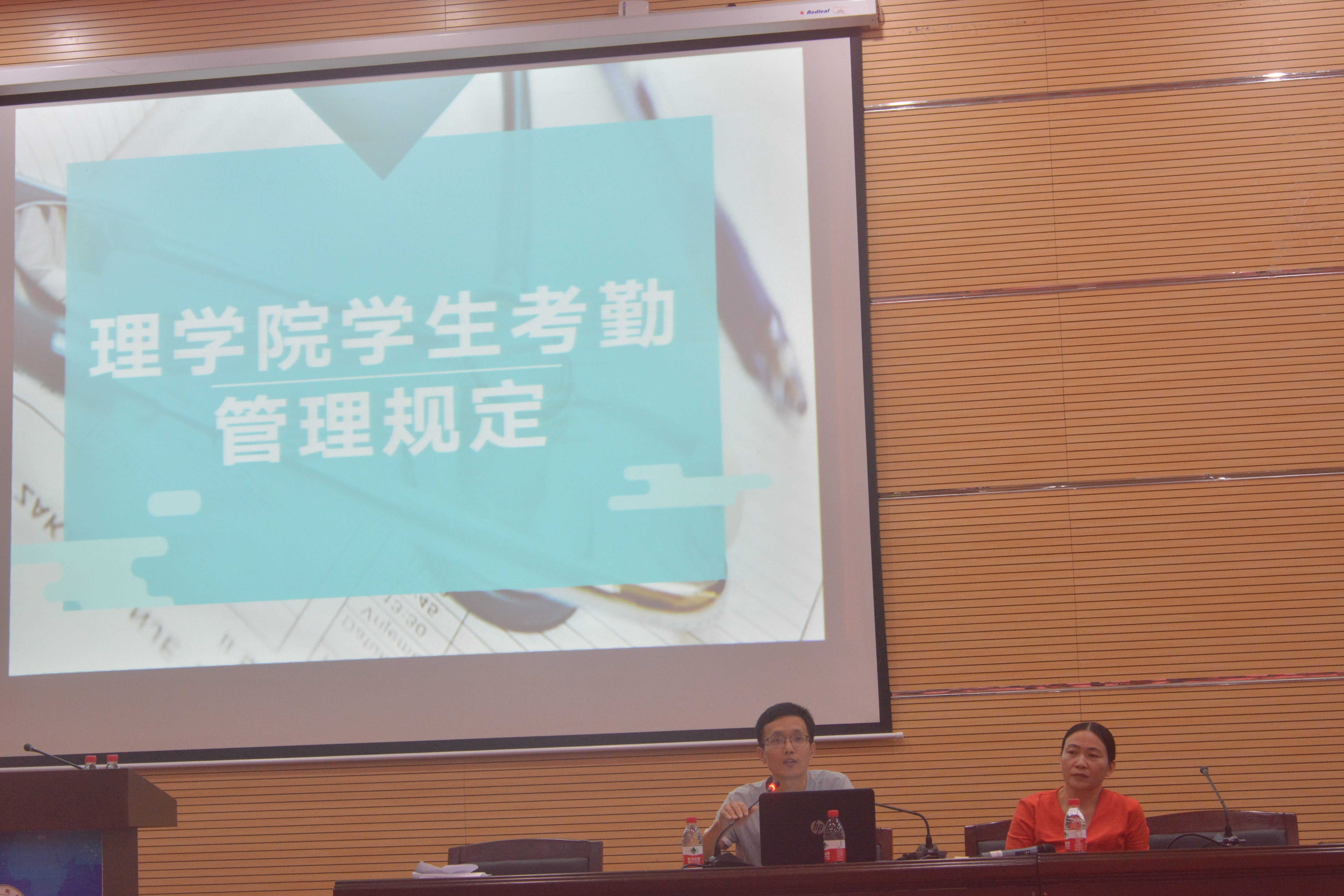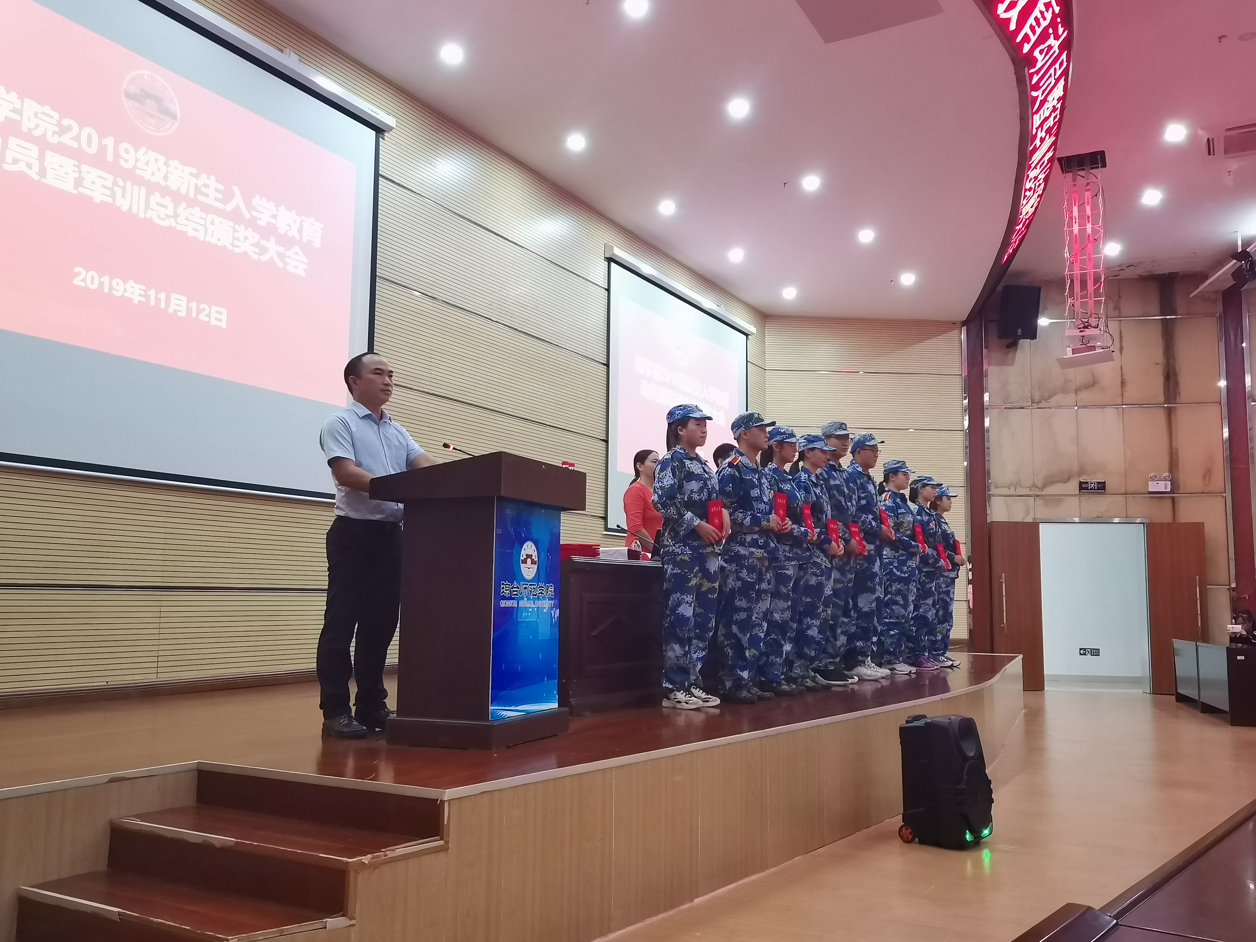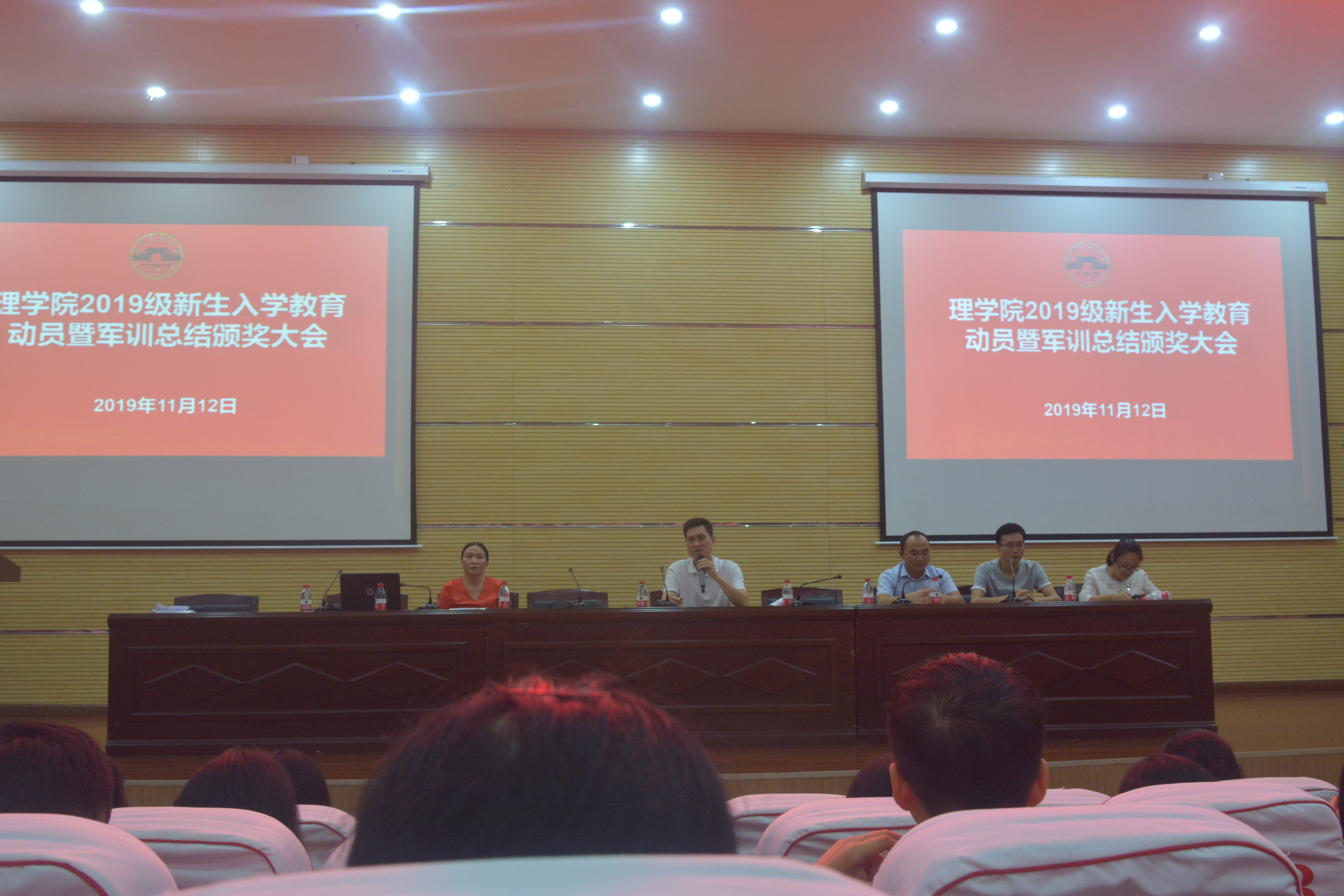 时光荏苒,花落花开又是一季。一张张青春朝气的笑脸,洋溢在校园四下,成为了一道道靓丽的风景线。为使2019级的新生们尽快适应大学校园的生活、学习与工作,同时总结他们在军训期间的表现情况,理学院于2019年11月12日16:00在图书馆报告厅召开了入学教育动员暨军训总结颁奖大会。理学院党政领导符方健主任,党总支陈明洁书记应邀出席了大会,学工办主任文海花老师、团总支书记吴钟熙老师,辅导员申明老师、申琳老师及理学院全体新生参加了大会。会议由文海花老师主持。