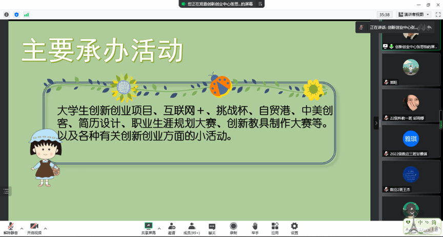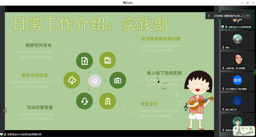 团委创新创业中心介绍了组织有关情况。创新创业中心实践部主要负责到梦空间发布、录取、签到、审查,双创纸质材料收集等工作;综合部主要负责策划书、学分审核表撰写,对接新媒体等工作。