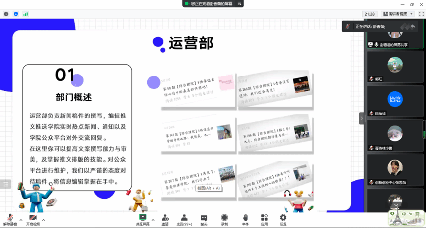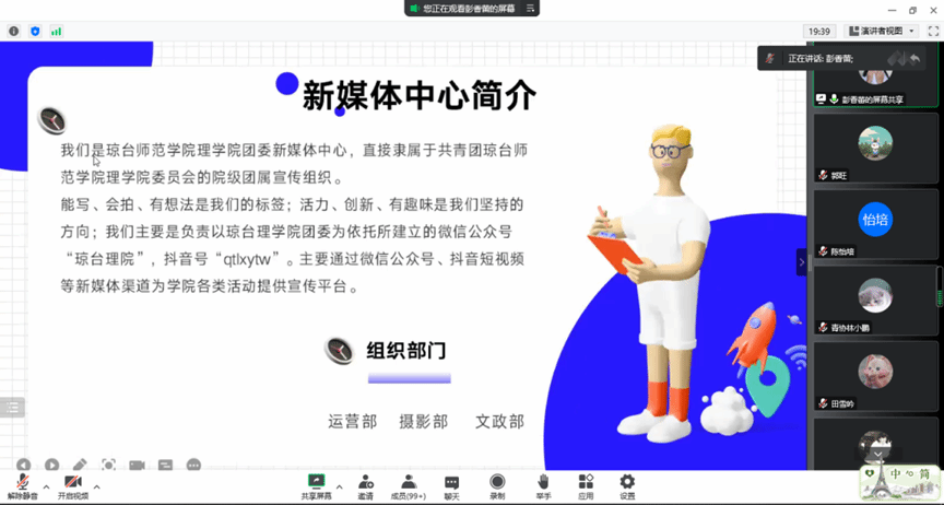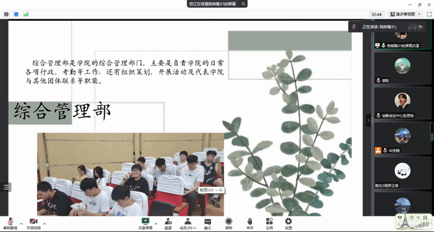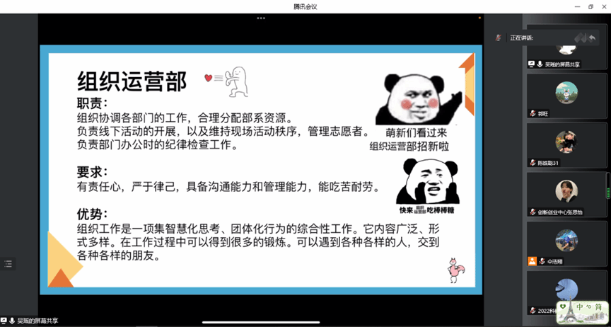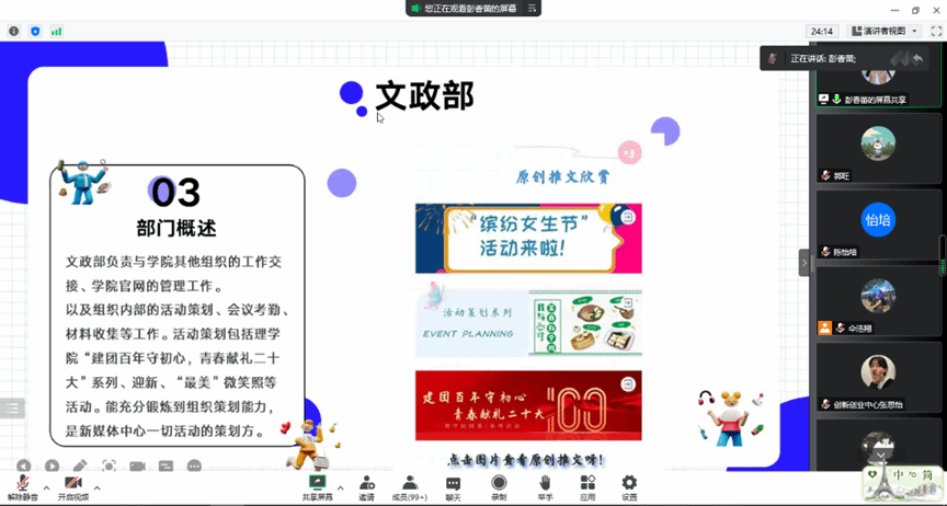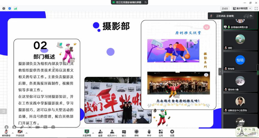 团委新媒体中心对部门职能进行了介绍。运营部主要负责新闻稿撰写和学院公众号管理和推文的编辑和发送;摄影部主要负责为团委组织提供技术支持和推文相关的专访工作;负责摄影,海报制作和视频剪辑;文政部主要负责与其他组织的工作交接和学院的官网的管理,组织内部活动的发布。