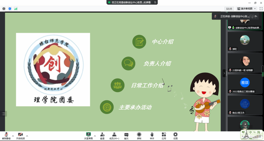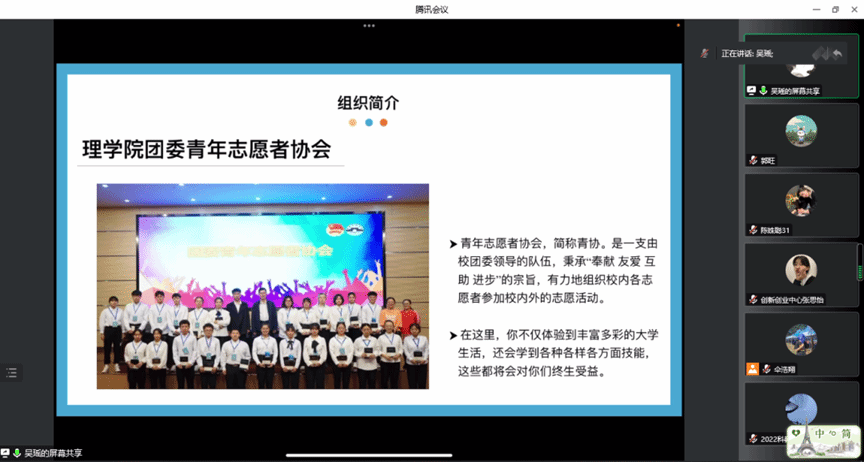 为了进一步做好理学院团委组织招新宣传工作。2022年10月7日下午15:00,理学院团委线上招新宣讲会成功举行。理学院团委书记谢言老师出席本次会议,团委各组织主要负责人和2022级新生参会。会议由理学院团委学生干部张思怡主持。