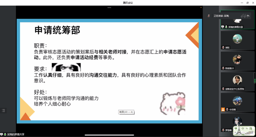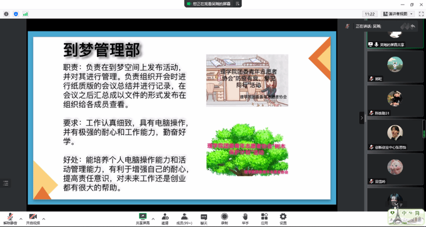 团委青年志愿者协会对各部门进行介绍并展示活动风采。组织运营部主要组织协调各部门工作,合理分配部系资源;活动策划部主要负责提出新颖想法和内容,制定活动时间和地点,撰写策划案;申请统筹部主要负责与老师对接工作,申请活动和活动经费;到梦管理部主要负责到梦空间活动的发布和管理,会议的记录总结;活动汇总部主要负责活动的汇总,对后续活动开展的总结。