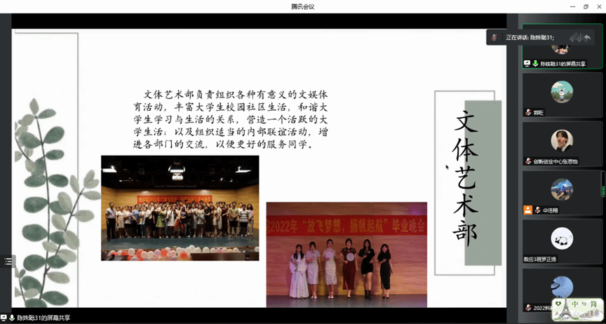 团委青年发展服务中心介绍了第二课堂管理相关情况。青年发展服务中心主要举办大大小小的类型丰富的日常活动,同时,负责青年大学习的收集。其中,信息采集部主要负责采集活动人员信息和青年大学习的收集,发布活动通知;组织策划部主要负责活动策划案撰写,审核各组织策划案,开展后勤活动,撰写会议记录;活动管理部负责活动发布、录取、完结等工作,并负责线上审核各班级和各组织的活动;活动审查部主要负责活动花絮检查,线下活动检查,毕业班第二课堂成绩单的审核等工作。