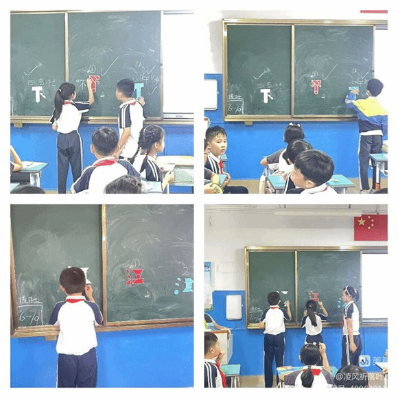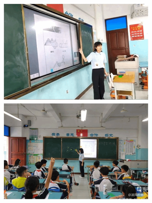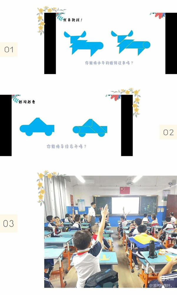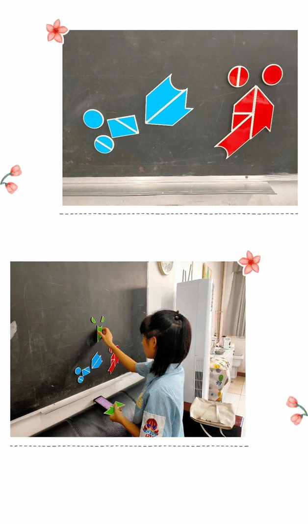 课堂中,教师鼓励学生相互交流思考,大胆创作,积极举手,去到讲台在黑板上用智力七巧板向同学分享展示自己的作品 。