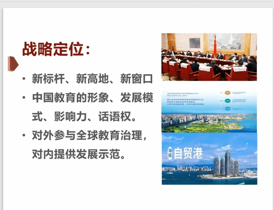 接着,曹阳老师举例了教育部和海南省联合印发《关于支持海南深化教育改革实施方案》,《关于支持海南深化教育改革实施方案》明确推动海南建设国际教育创新岛,全面深化教育改革、扩大教育开放把海南建设成为中国特色社会主义教育开放发展、创新发展的生动范例。特别讲了海南的四大战略地位,建设深化改革开放试验区、建设国家生态文明试验区、建设国际旅游消费中心、建设国家重大战略服务保障区。