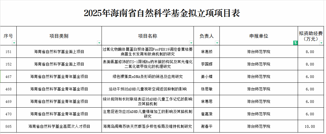 近日,海南省科学技术厅正式发布了《关于2025年海南省自然科学基金拟立项项目的公示》,理学院凭借卓越的科研实力,共有4个科研项目成功获得立项支持,这一佳绩无疑是对我院长期以来坚持教学与科研并重理念的最好肯定。