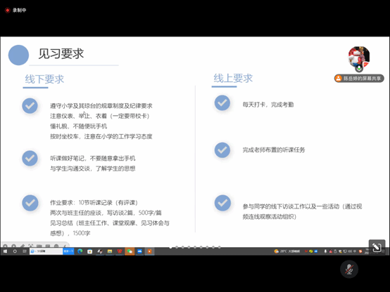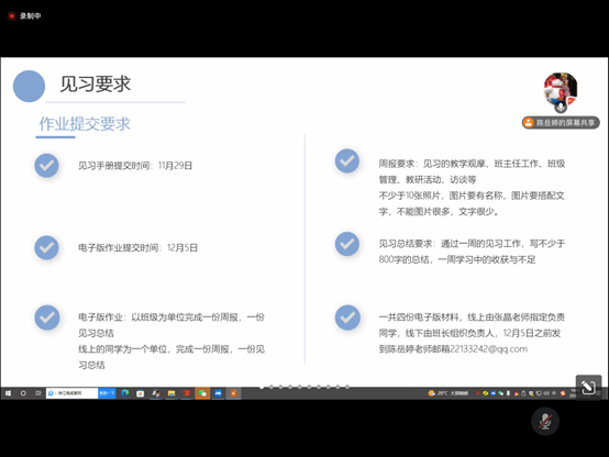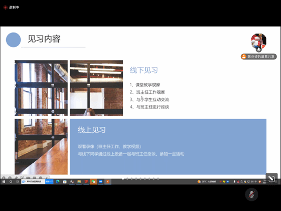 同时,陈岳婷老师介绍了本次教育见习的相关内容。本次教育见习分为四个内容:一是开展课堂教学观摩,二是开展班主任工作观摩,三是与小学生观摩互动,四是与班主任进行座谈。线上见习的同学将与线下同学通过视频的方式共同学习。