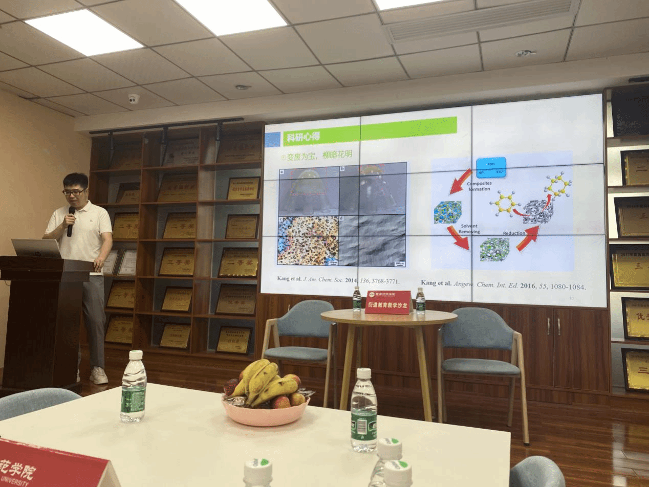 康欣晨研究员结合自己多年的科研经验,跟大家交流了如何利用离子液体开展材料的合成和化学反应研究思路。他将最具特色绿色溶剂中的离子液体广泛应用,利用其独特的性质开展系列研究,康老师用幽默风趣通俗易懂的语言,删繁就简深入浅出地进行了剖析。报告会现场气氛异常活跃,大家为康欣晨研究员的年轻有为、积极进取、科研思路清奇所感染。康老师用非常生动的语言引导大家思考如何从自然界中最为简单的角度去发现科学问题并进行科学研究,同时,也鼓励大家将勇于尝试,不要担心科研的失败,失败换个角度即为成功,现场的师生们均表示康老师的报告不仅启发了大家的研究思路;同时,对老师们的科研思路寻找也有很好的借鉴意义。