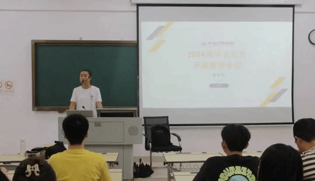 会议中,陈岳婷老师主要围绕毕业论文开题答辩前的准备工作,答辩时的流程、纪律和答辩后论文选题的方案修改和论文立意的交流讨论等问题为毕业生们进行讲解。随后,她针对毕业生们提出的问题逐一进行解答。