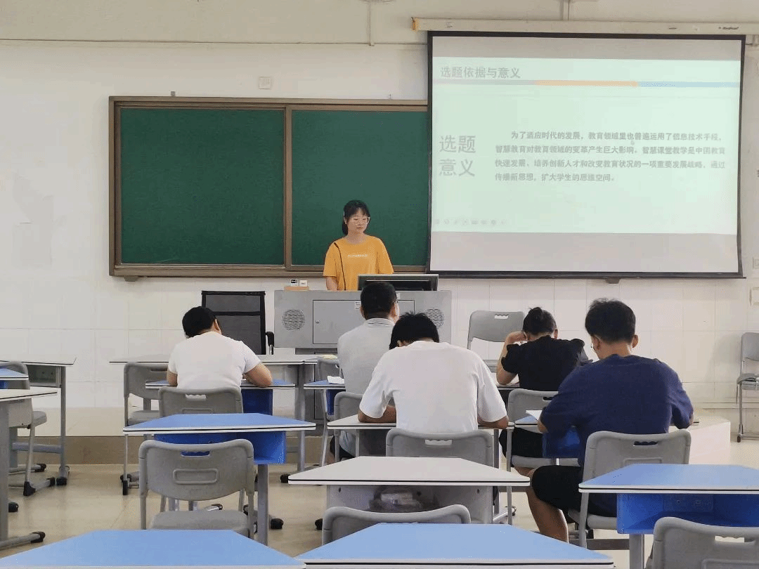 答辩时,首先由答辩学生展示PPT,每位同学围绕选题依据及意义、研究目标与主要内容、研究方法、研究手段及参考文献等内容展开介绍。