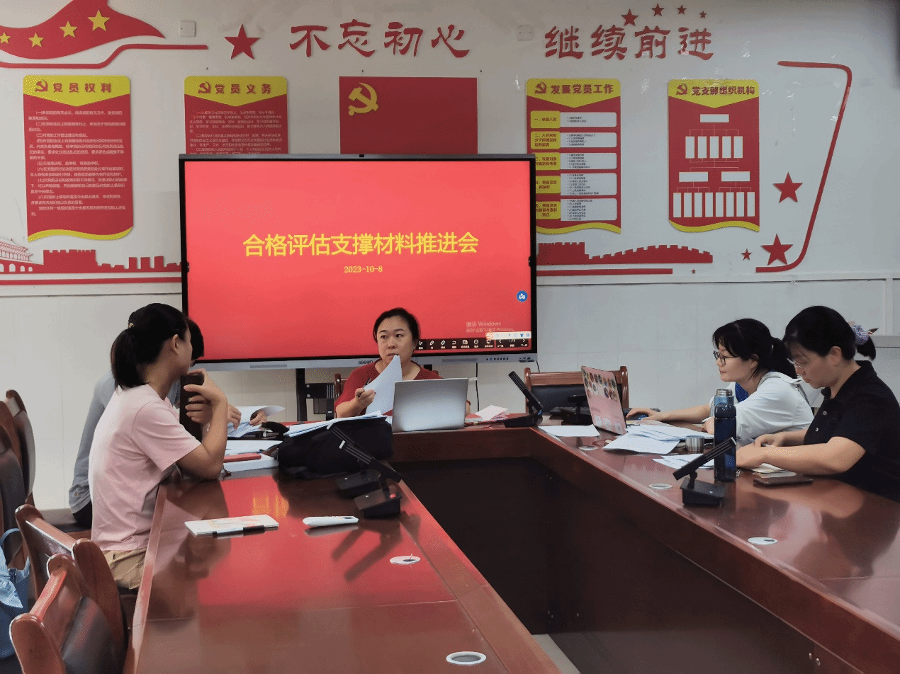 2023年10月8日下午,理学院程睿菁副院长主持召集学院各专业系主任及相关骨干教师开展合格评估支撑材料推进会,就本科教学工作合格评估二级学院支撑材料的收集和提炼进行工作分工,具体推动落实,并对相关综述材料及典型案例进行讨论研究。会议要求各专业要组成攻坚团队,坚持问题导向、目标导向、责任导向,加班加点准时完成材料上报工作,同时要深挖亮点、充实数据、注重细节、精益求精,保持严谨细致的工作作风,确保材料内容客观真实、优质丰富,以求真务实的工作态度推动各项评估准备工作。