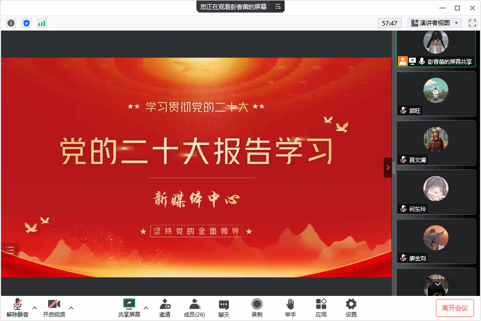 创新创业中心负责人张思怡总结道,大会的主题是大会精神的集中体现,是大会报告的灵魂和主旨。领会好大会主题的丰富内涵,对于全面准确领会大会精神,特别是报告的精神非常有帮助。党的十五大首次提出大会的主题。党的十六大、十七大、十八大、十九大都依此惯例,在报告的开头郑重提出大会的主题,旗帜鲜明地向党内外、国内外宣示,党在新的征程上举什么旗、走什么路、以什么样的精神状态、朝着什么样的目标继续前进。党的二十大精神不仅高度凝练、言简意赅,而且蕴含着十分丰富的政治内涵。