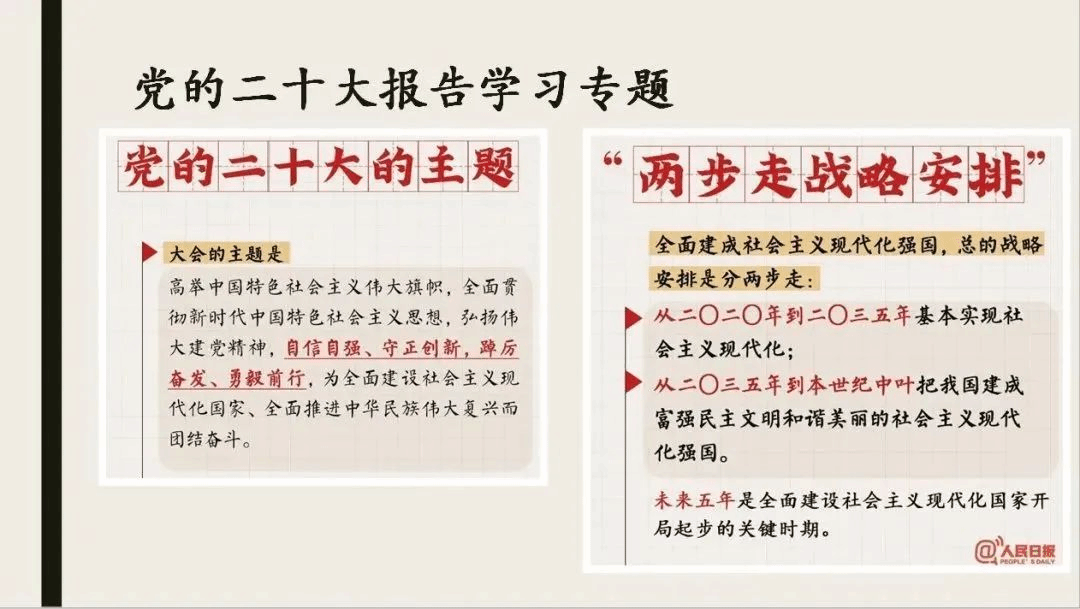 2023 年1月6日,组织部于线上开展了党的二十大精神学习会议,会议内容主要为解读党的二十大精神关键词以及未来应该怎么干。组织部部长曾旭康提到,明确未来的发展方向以及应该怎样做,应当正确解读党的二十大精神中的关键词。党的二十大精神中提到,中国共产党的中心任务就是团结带领全国各族人民全面建成社会主义现代化强国、实现第二个百年奋斗目标,以中国式现代化全面推进中华民族的伟大复兴。全面建成社会主义现代化强国,总的战略安排是分两步走,未来五年是全面建设社会主义现代化国家开局起步的关键时期。报告中提到的“新型能源体系”“更高水平的平安中国”等崭新的关键词值得引起重视。对于未来五年,我们应该怎么做?在报告中有着明确的指引。如推进新型工业化,全面推进乡村振兴,加快建设世界重要人才中心和创新高地,筑牢国家安全人民防线等。