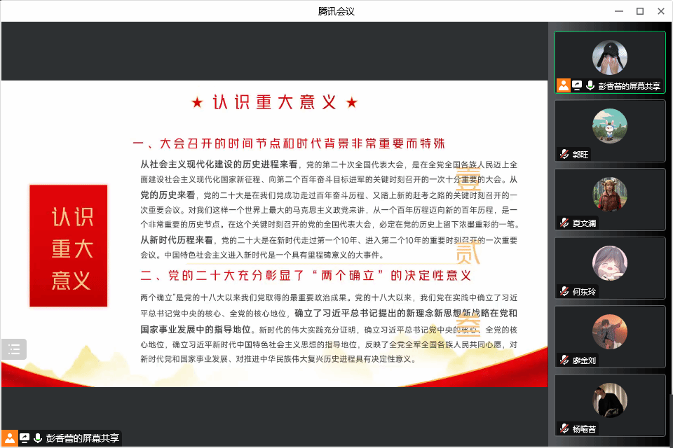 在本次线上学习会议中,团委各组织深刻学习了解了“党的二十大精神”的重大意义,在会议中,大家互相交流,表达自己学习”党的二十大精神“的感悟,团委各组织干部纷纷表示要坚持以党的政治建设为统领,把“两个确立”的政治成果转化为坚决做到“两个维护”的政治自觉、行动自觉,以中华民族伟大复兴中国梦为己任,用奋斗书写新时代的青春答卷,用实际行动践行“请党放心,强国有我”的铮铮誓言。