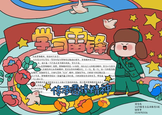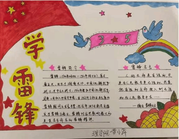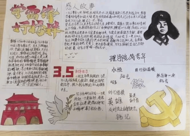 本次活动得到了同志们的的积极响应。同志们通过绘画、摘录等形式,描绘了雷锋肖像、书写了雷锋事迹,宣传了雷锋精神,同时也进一步加强了对雷锋精神的理解。手抄报作品设计新颖,人物栩栩如生,字迹工整清晰,主题鲜明、内容丰富、美观大方,既很好地展现了理学院学子的艺术素养,也生动地呈现了雷锋同志不平凡的人生。实践证明,无论时代如何变迁,雷锋精神永不过时。