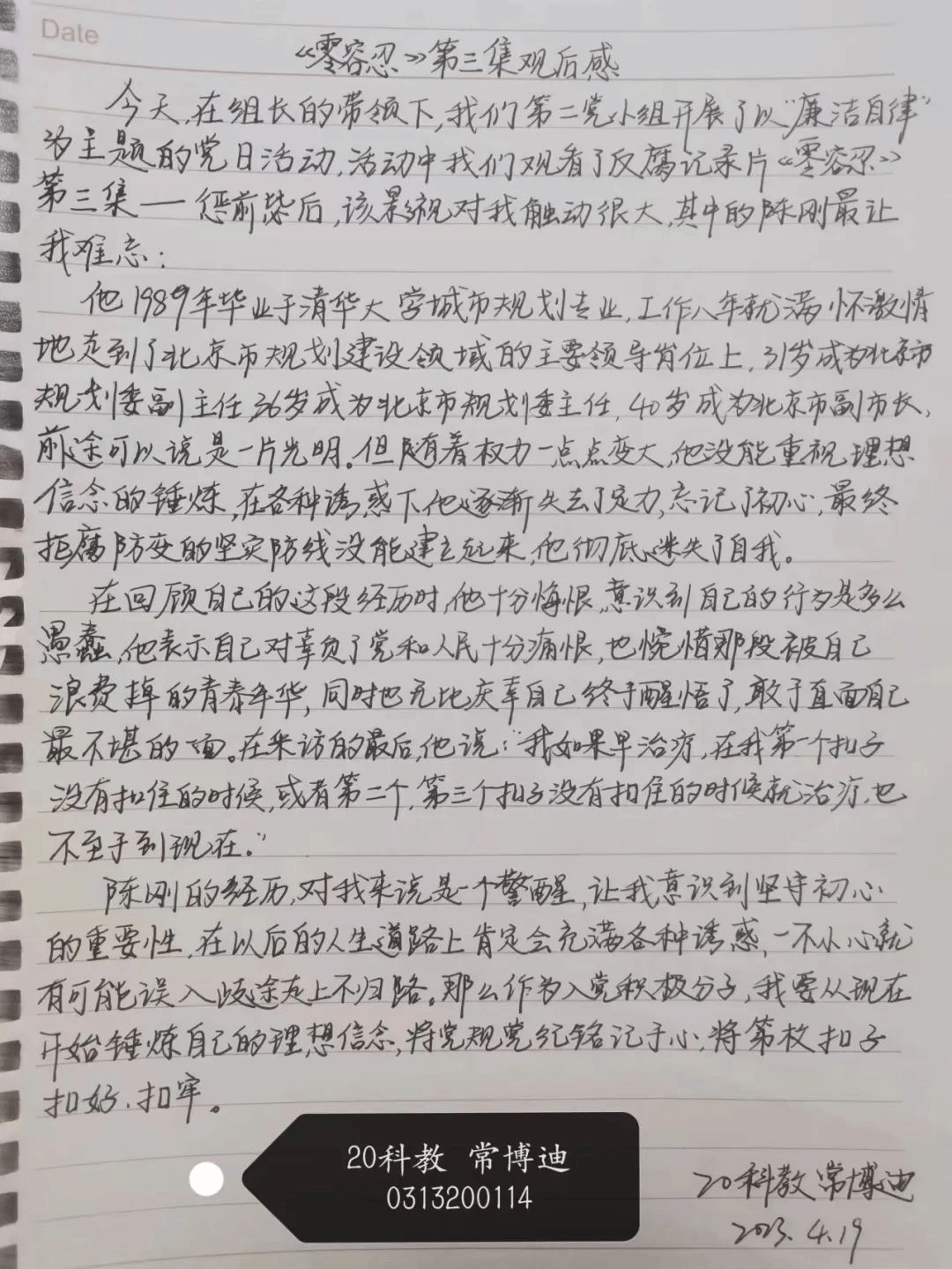 朱牧宇同志谈到:通过观看今天《零容忍》的片段,我们可以感受大家对贪污现象表示了强烈的反对态度。作为中国共产党的后备军,我认为,贪污严重侵蚀了党的形象和人民群众对党的信任,对党和国家的长远发展造成了严重的损害。视频反复强调了反贪污斗争的重要性和紧迫性,必须坚持零容忍、严惩不贷的原则,加强党风廉政建设和反腐败斗争,确保党始终保持高度纯洁性。