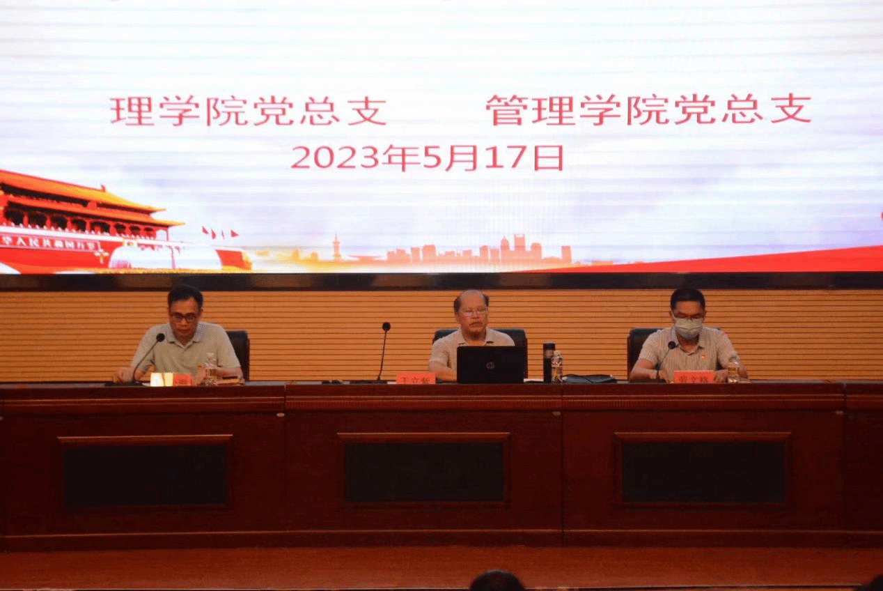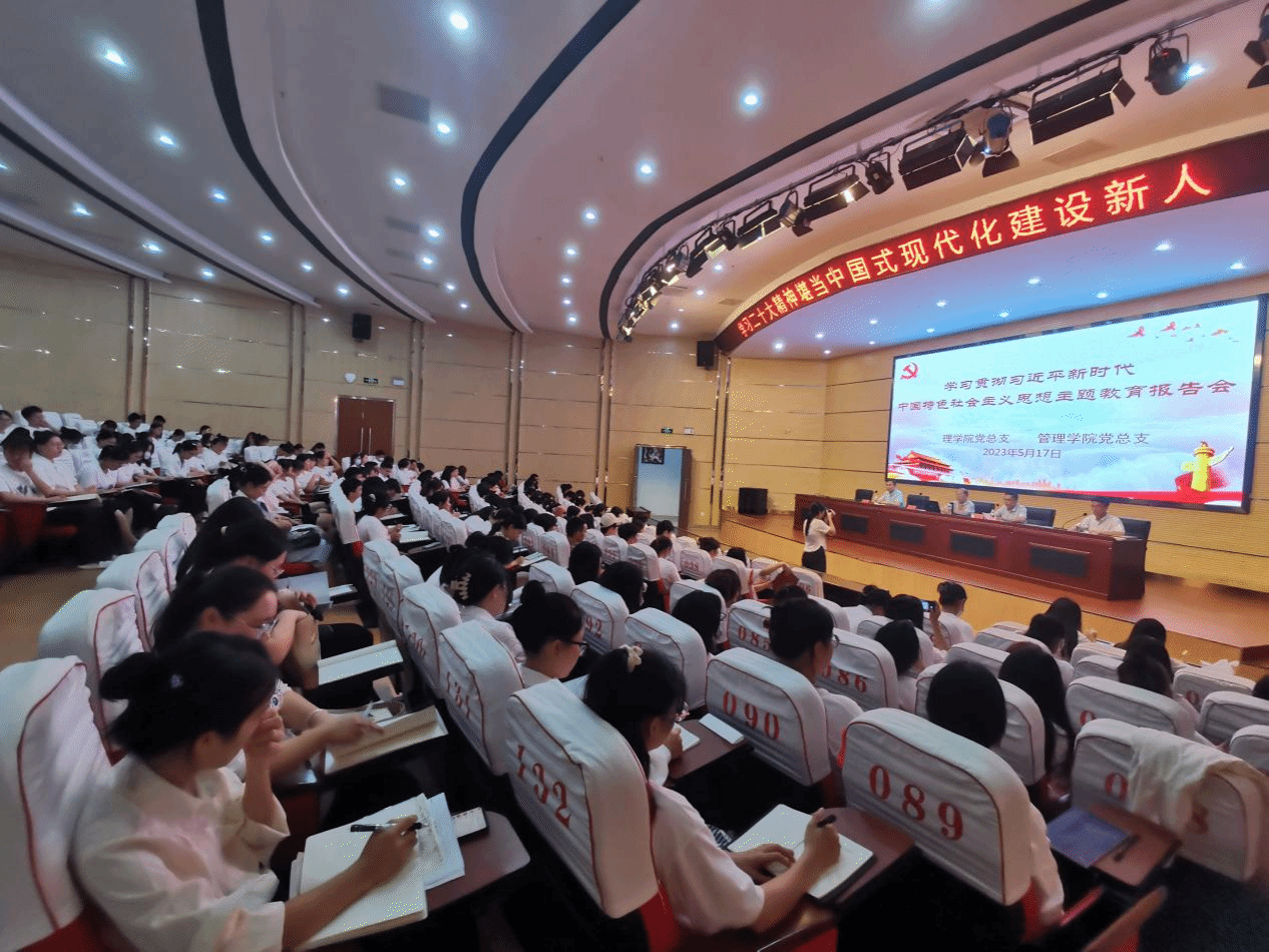 2023年5月17日晚上7点,理学院党总支、管理学院党总支在图书馆报告厅联合开展学习贯彻习近平新时代中国特色社会主义思想主题教育报告会,邀请校党建组织员、关工委副主任王立紫同志为两个学院的学生党员、入党积极分子共204人作了题为《学习党的二十大精神堪当中国式现代化建设新人》的报告。劳文格、颜松海两位学院总支书记出席并作了讲话。