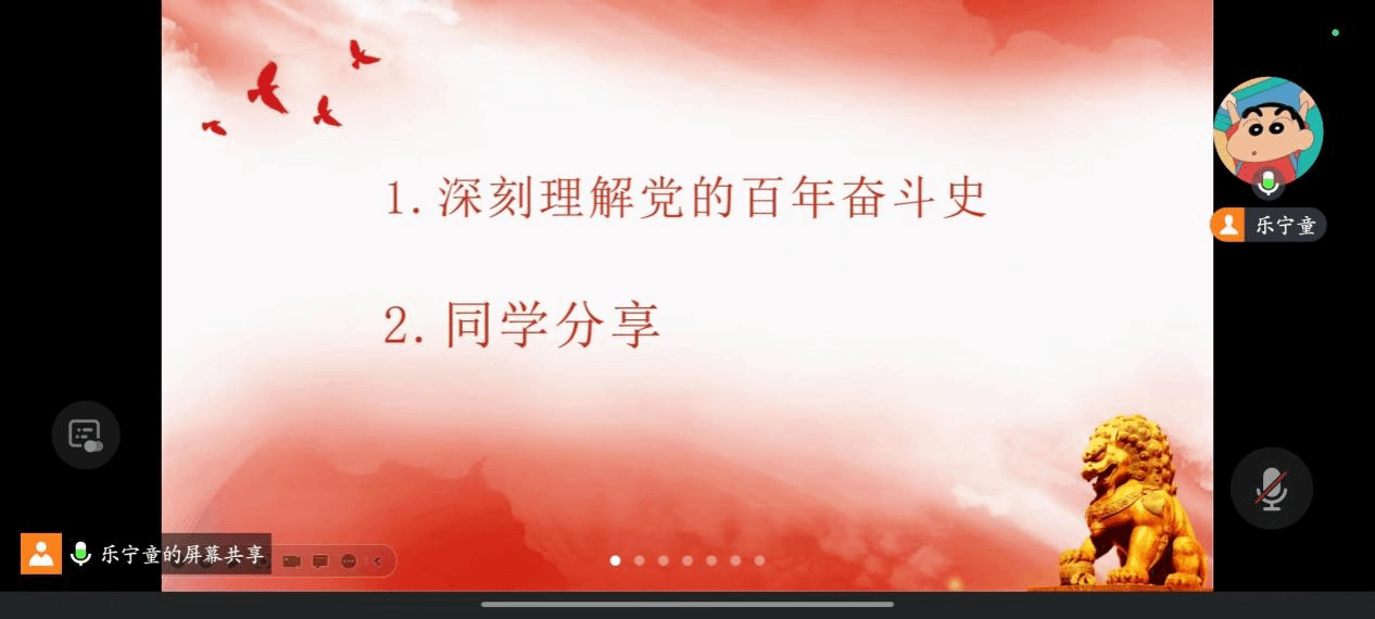 在腾讯会议上,宣讲人乐宁童同志从党的百年奋斗史讲起,首先播放了党的百年奋斗历程的视频,通过观看视频,带大家简单回顾了党经历的几个重要事件,而后从传承革命精神、增强勇气力量、不断解放思想、与人民同甘共苦这四个方面,带领同学们把党的精神融入自己的学习生活,融入自己的内心理想,在新的时代建功立业,勇做担当民族复兴大任的时代新人。最后强调我们要不断地向历史学习,深刻理解党的百年奋斗史,永远跟党走。