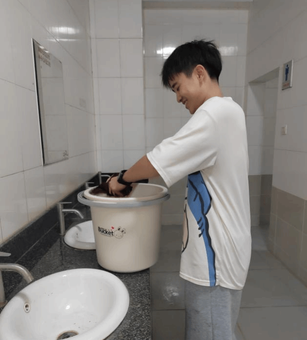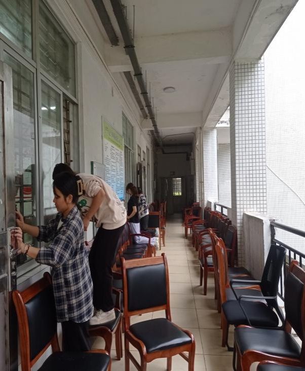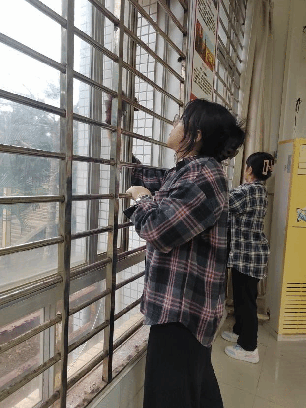 进行完第一次大致的清扫后,同学们马上进行更加细致地彻底清洁。刚刚打水回来的同学大汗淋漓、气喘吁吁,但却没有停下的意思,只见同学们立马拿起浸过水的抹布,在有灰尘的地方用力地上下晃动手臂,清除一切尘灰。灰蒙蒙的玻璃在擦洗后变得干净又明亮。