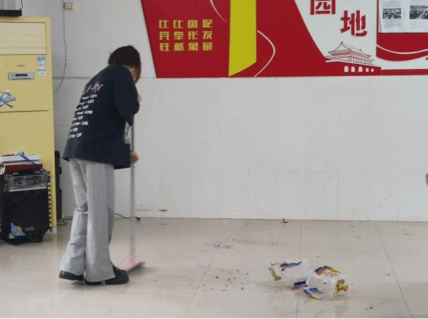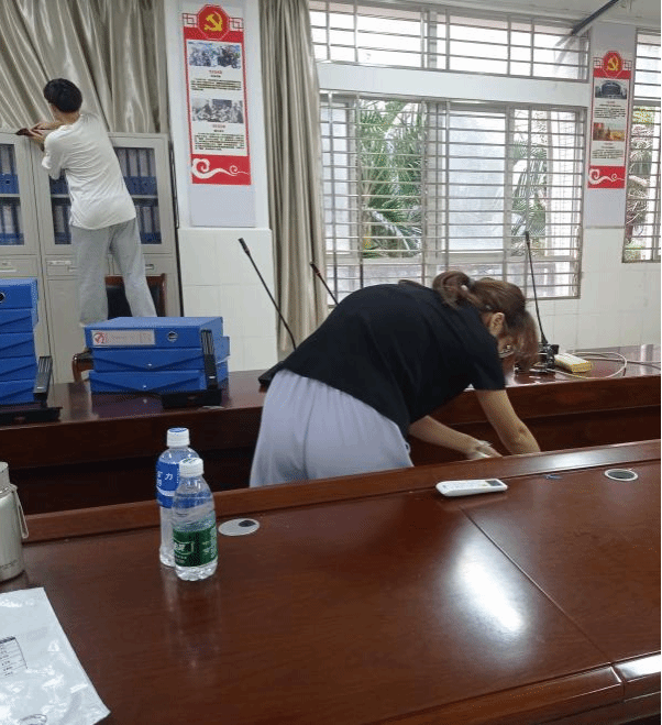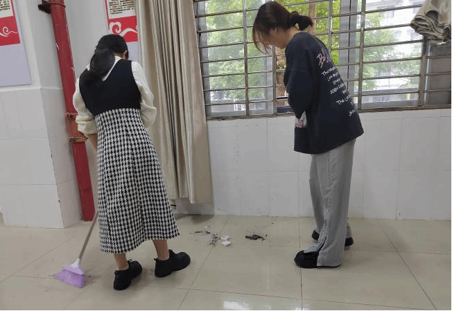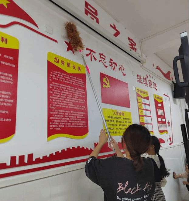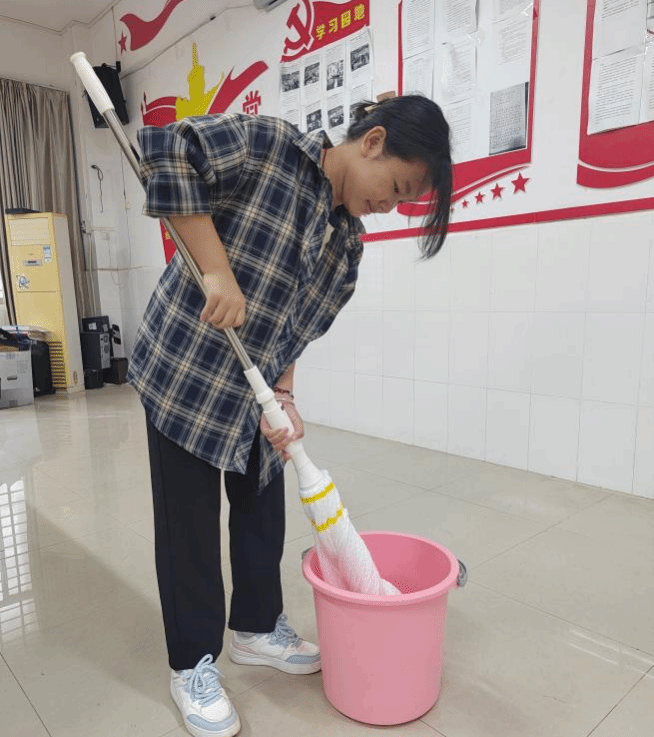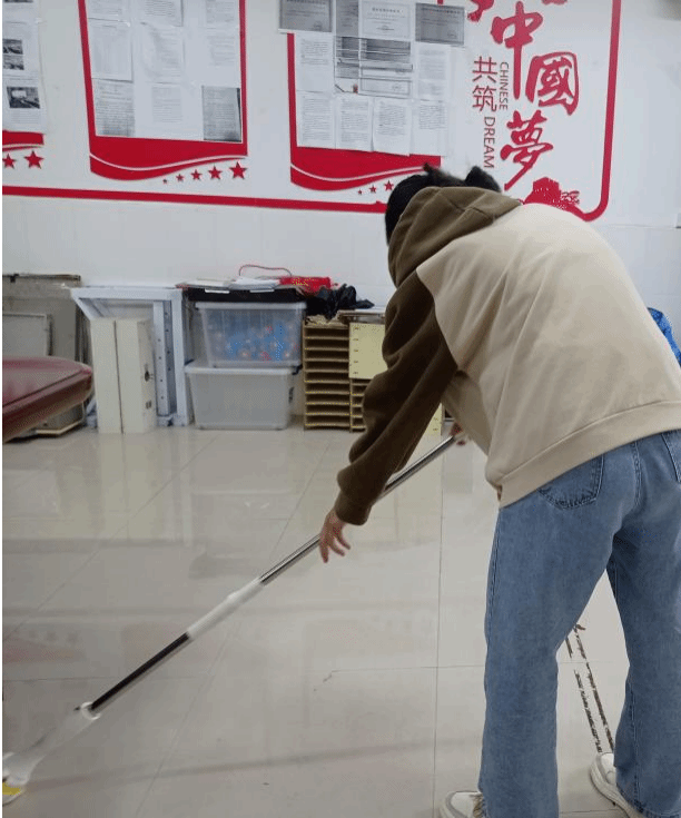 经过一遍又一遍的换水、拖地、擦洗,党员会议室逐渐变得一尘不染、十分亮堂。清理完毕后,同学们又进行了一系列的收尾工作:洗拖把、洗抹布、洗桶、收拾垃圾等。清洗结束后,有序地把走廊的板凳全部搬回党员活动室。一切都完毕后,大家的面容上都洋溢着满满的成就感和满足感,发自肺腑地感受到了通过自己的辛勤付出换来的自豪和荣誉。