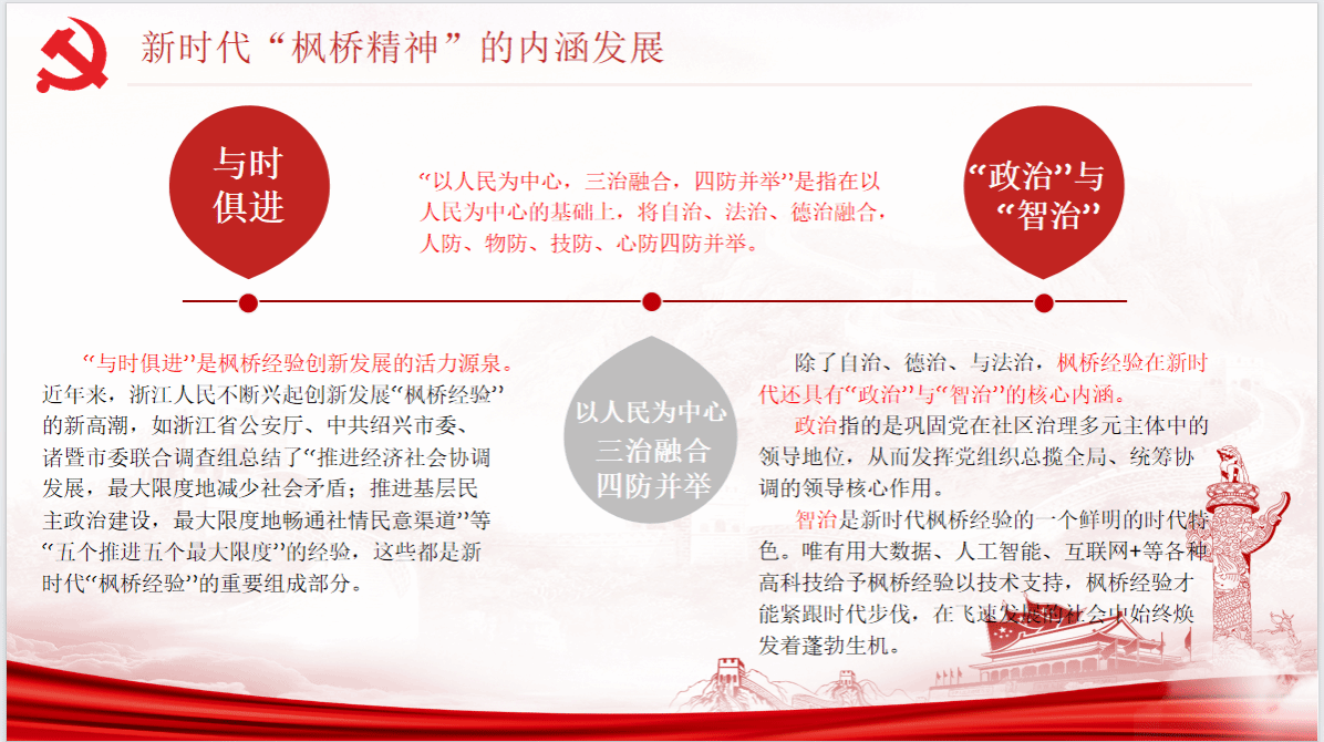 随后,张晨阳同志介绍了新时代“枫桥精神”的内涵发展。一是“与时俱进”是新时代“枫桥精神”创新发展的活力源泉,近年来,浙江人民不断兴起创新发展“枫桥经验”的新高潮;二是新时代“枫桥精神”在以人民为中心的基础上,将自治、法治、德治融合,人防、物防、技防、心防四防并举;三是“枫桥精神”在新时代还具有“政治”与“智治”的核心内涵。