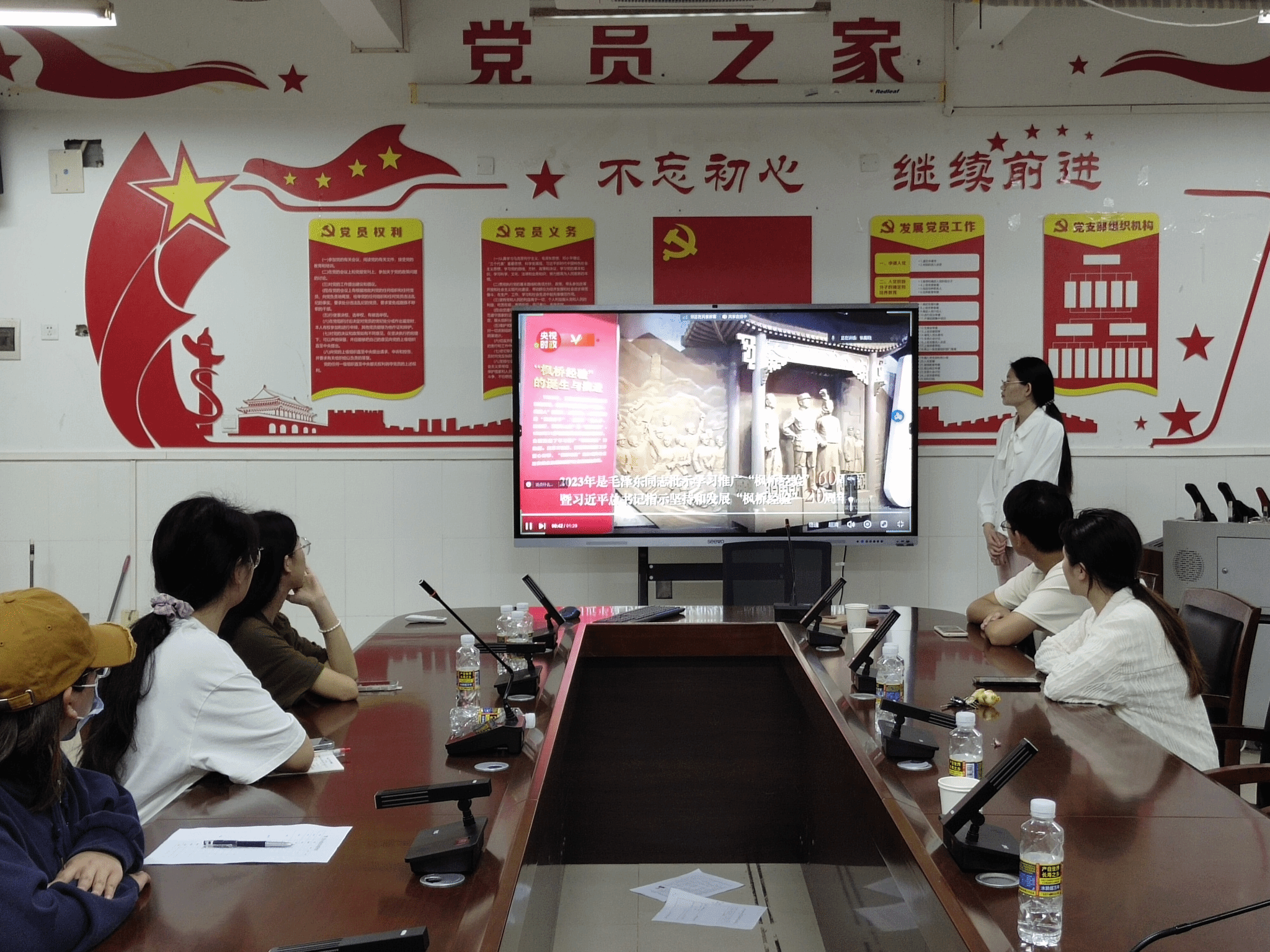 其次,张晨阳同志带领在场同志通过视频的方式云游“枫桥经验”陈列馆。视频里,枫桥经验陈列馆的画面徐徐展开,60年前,浙江枫桥干部群众创造了“依靠群众就地化解矛盾”的“枫桥经验”,“枫桥经验”从浙江诸暨发端向全国发展,凝结着一代代中国共产党人带领人民创新社会治理的探索,2023年是毛泽东同志批示学习和推广“枫桥经验”60周年,暨习近平总书记指示坚持和发展“枫桥经验”20周年,枫桥经验陈列馆充分展示“枫桥经验”的发展历程和时代价值,陈列馆建成以来,累计接待全国参观团21.15万人次,成为宣传推广“枫桥经验”的重要阵地,视频在题为“治国安邦,重在基层,枫桥经验,历久弥新”的总结中结束。