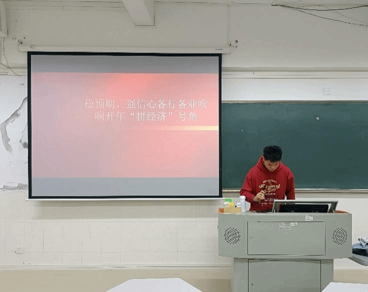 为了强化学生党支部成员的政治观念延续红色血脉夯实精神之本,不断谱写马克思主义中国化时代化新篇章,2024年2月27日,理学院学生党支部在实验楼B206开展了稳预期、强信心,各行各业吹响开年“拼经济”号角宣讲会。