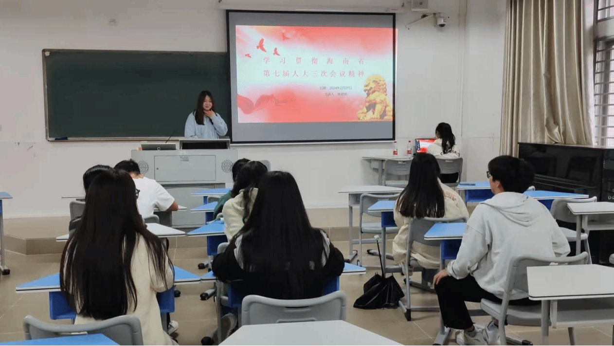 为进一步深刻把握海南省七届人大三次会议精神,了解海南各市县发展情况,将坚持稳中求进,以进促稳,先立后破,完整、准确等新发展理念运用到学习生活中。理学院学生党支部于2024年2月27日在实验楼B205采取线上+线下的方式开展了“学习贯彻海南省七届人大三次会议精神”的主题党日活动。本次活动由张思怡同学作为主讲人,全体参会人员认真聆听学习。
