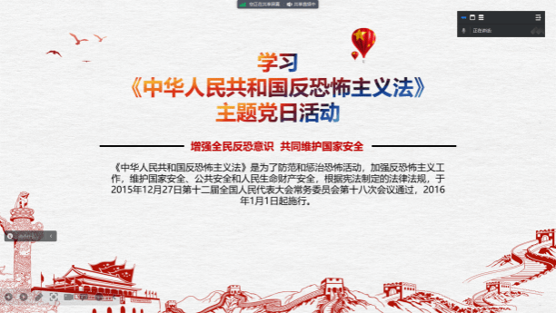 首先,郭旺同学从何为《中华人民共和国反恐怖主义法》出发,介绍了《中华人民共和国反恐怖主义法》颁布的时间与特点。其次,他向各位党员、入党积极分子科普了什么是恐怖主义,恐怖主义是指通过暴力、破坏、恐吓等手段,制造社会恐慌、危害公共安全、侵犯人身财产,或者胁迫国家机关、国际组织,以实现其政治、意识形态等目的的主张和行为。随后,郭旺同学从“完善社会主义法律体系”“明确反恐怖主义概念”“凸显预防与防范的重要性”三个方面入手,使同学们了解到《中华人民共和国反恐怖主义法》颁布的价值与意义。同时,组织“云观普法教育之——《中华人民共和国反恐怖主义法》”,通过视频学习进一步深入了解《中华人民共和国反恐怖主义法》,全体党员及入党积极分子均专心致志、认真观看。