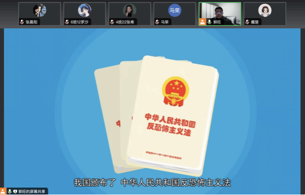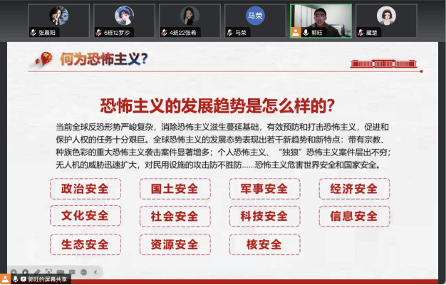 平安,是民族复兴的巍巍基石,也是亿万民生福祉所系。建设平安中国,加强反恐力度,有利于维护国家长治久安,促进人民安居乐业。为了增强同学们的法治意识,让同学们深入了解反恐怖主义的意义与价值,2024年1月15日,理学院学生党支部在线上开展以“反恐法律你我知,平安中国共建设”为主题的《中华人民共和国反恐怖主义法》学习会主题党日活动。学习会由郭旺同学主持。