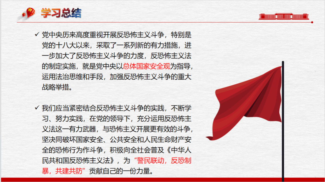 通过本次学习《中华人民共和国反恐怖主义法》活动,同学们增强了法治意识,深入了解了反恐怖主义的价值与意义。身为理学院学生党支部的一员,我们应当紧密结合反恐怖主义斗争的实践,不断学习、努力实践,在党的领导下,充分运用反恐怖主义法这一有力武器,与恐怖主义开展更有效的斗争,坚决同破坏国家安全、公共安全和人民生命财产安全的恐怖行为作斗争,积极向全社会普及《中华人民共和国反恐怖主义法》,为“警民联动,反恐制暴,共建共防”贡献自己的一份力量。