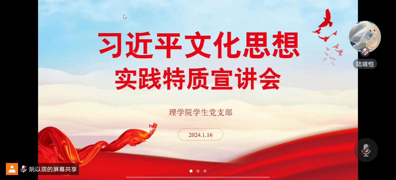 为帮助青年学生准确认识和把握习近平文化思想实践特质的丰富内涵,进一步增强民族自豪和文化自信,自觉传承、弘扬、创新中华优秀传统文化,2024年1月16日,理学院学生党支部于线上开展了“习近平文化思想实践特质宣讲会”主题党日活动。会议由阮以萌同志主持。
