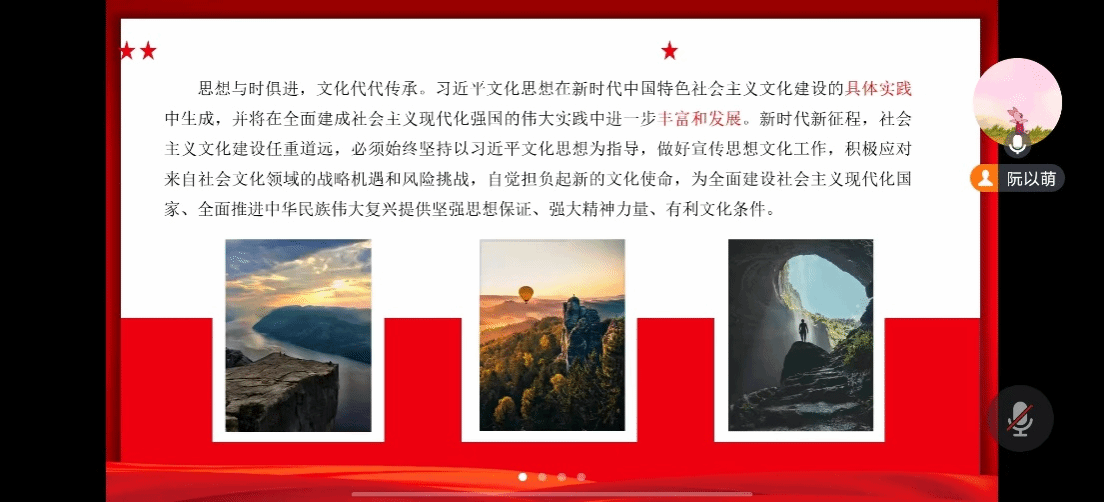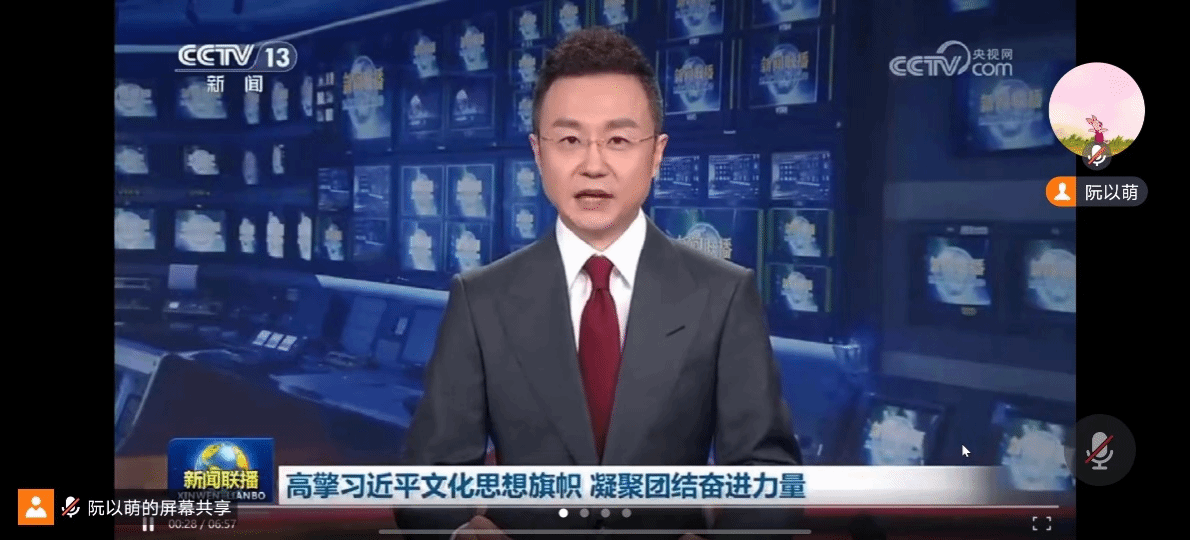 会议第二项,同学们观看相关视频。视频中提到我们必须始终坚持以习近平文化思想为指导,做好宣传思想文化工作,积极应对来自社会文化领域的战略机遇和风险挑战,自觉担负起新的文化使命。