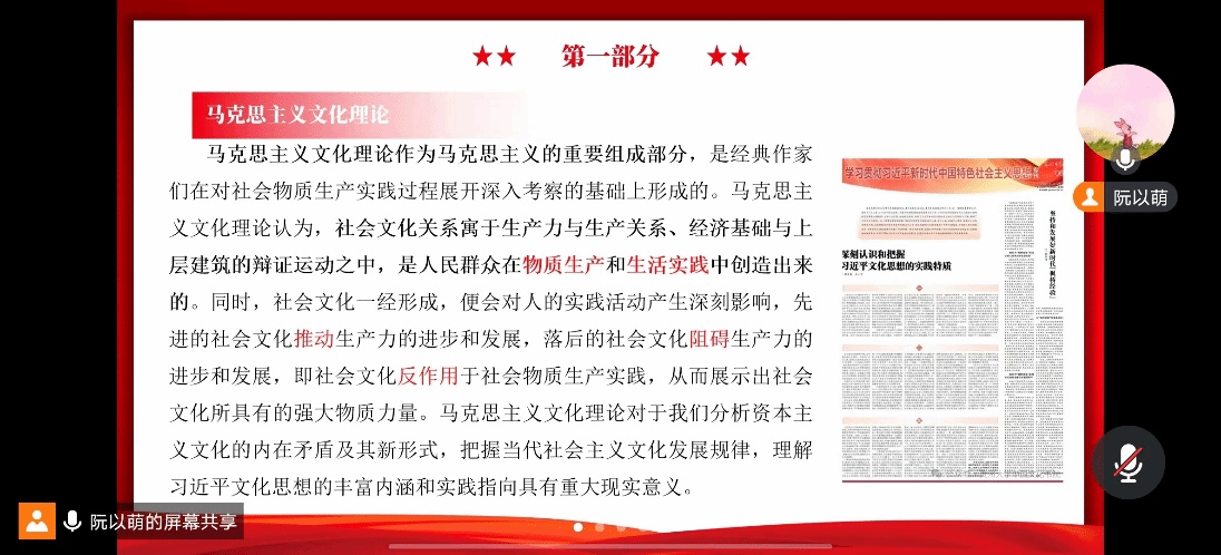 随后,阮以萌同志从三个部分讲解了习近平文化思想的实践特质。她提到马克思主义文化理论作为马克思主义的重要组成部分,对于理解习近平文化思想的丰富内涵和实践指向具有重大现实意义。习近平文化思想立足于时代又引领时代,来源于实践又指导实践,它指导我们在实践创造中进行文化创造,以守正创新的正气和锐气赓续历史文脉、谱写当代华章。其次,阮以萌同志提到在新时代新征程必须自觉坚持以习近平文化思想为引领,从聚焦用党的创新理论武装全党、教育人民这个首要政治任务;促进文化事业和文化产业繁荣发展,扎实推进中国特色社会主义文化建设;讲好中国故事,增强中华文明传播力影响力三个方面推进文化自信自强,铸就社会主义文化新辉煌。