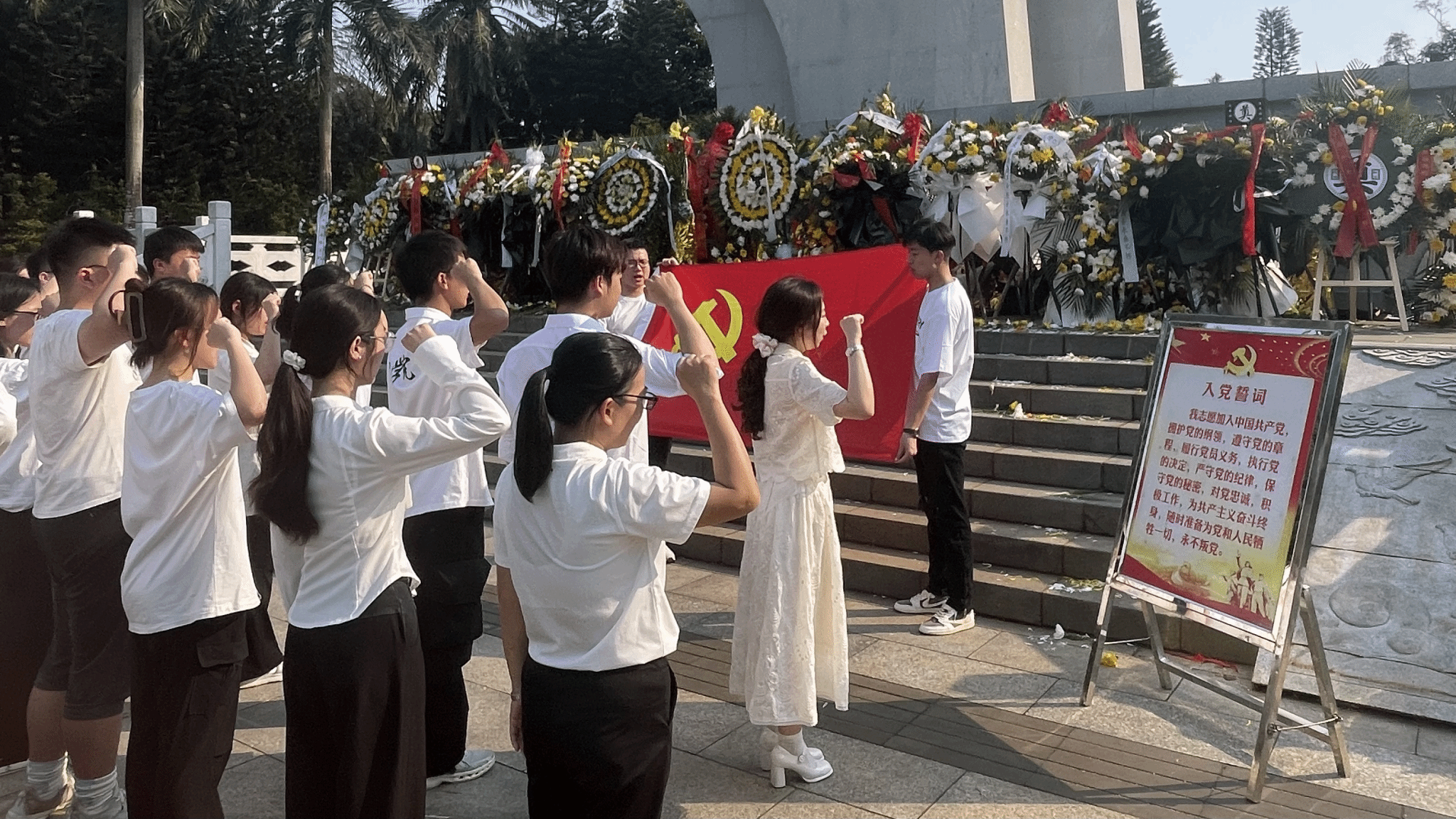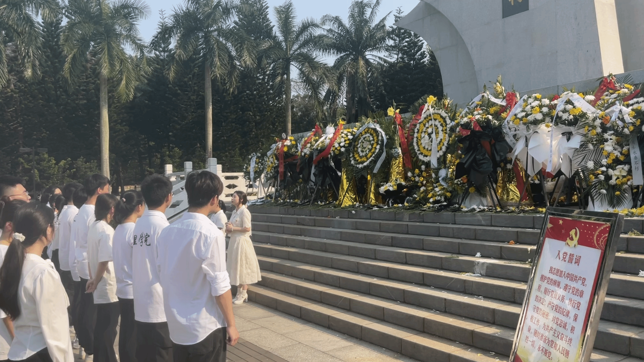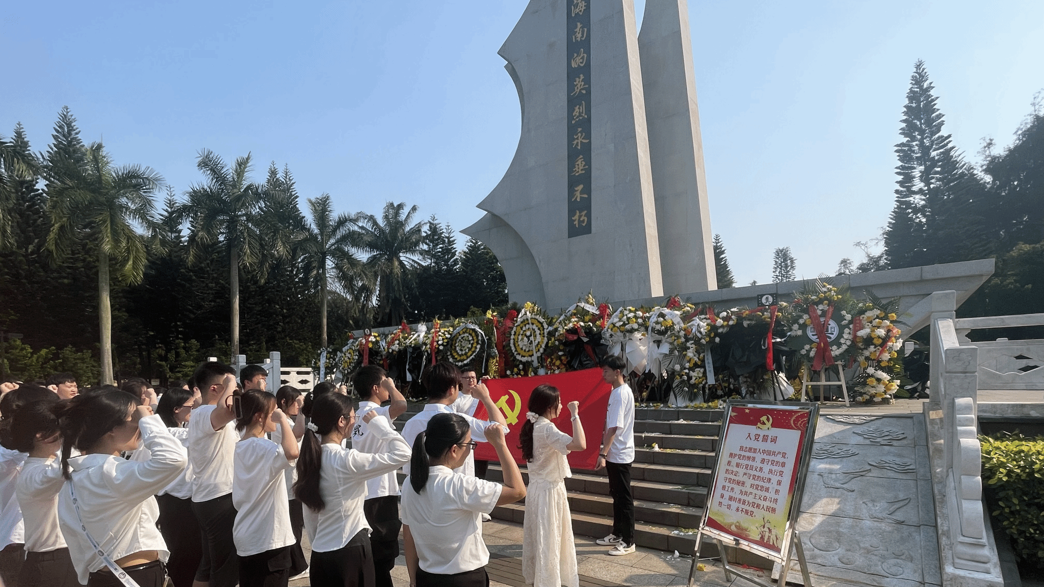 炎热的午后,党员、入党积极分子们顶着烈日踏入解放海南岛战役烈士陵园,园中庄严肃穆的氛围使我们不禁肃然起敬,每一个脚步都显得分外沉重。