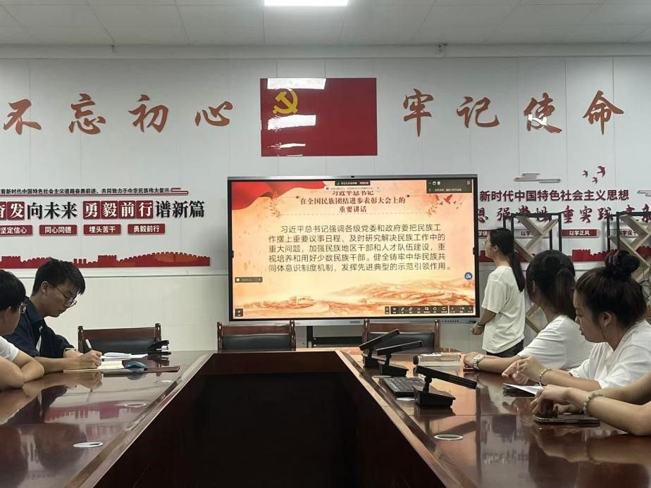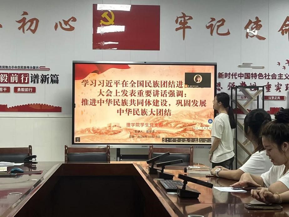 2024年10月13日,理学院学生党支部在实验楼B107会议室开展了“学习贯彻习近平在全国民族团结进步表彰大会上重要讲话精神”主题党日活动。在新时代的征程上,实现伟大复兴,推进中国式现代化、实现共同富裕,一个民族都不能少。要加快民族地区高质量发展,促进各地区在经济上更加紧密地连在一起、融为一体,扎实推进各民族共同富裕。本次活动旨在学习习近平在全国民族团结进步表彰大会上发表重要讲话强调:推进中华民族共同体建设,巩固发展中华民族大团结。