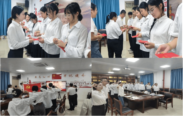 11位新发展中共预备党员上台,由刘华民、毛文迈、王根、申琳、陈茹猛同志依次为同志们颁发党徽、《中国共产党章程》、党员学习记录本,各位同志互戴党员徽章,并合影留念。随后,全体党员面向党旗,举起右拳庄严宣誓,铿锵有力地表达了为党的事业奋斗终生的坚定信念。