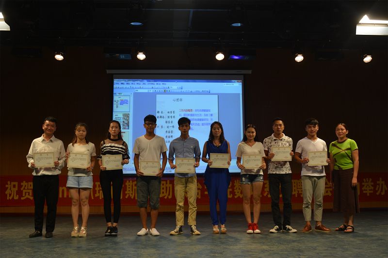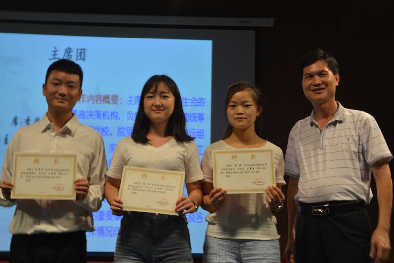 系部领导和辅导员分别给新一届学生会主席袁和各部门颁发聘书并合影留念。陈明洁书记和文海花主任也对新一届学生会工作提出了要求和希望。受聘仪式以全体师生合唱团歌圆满落幕。