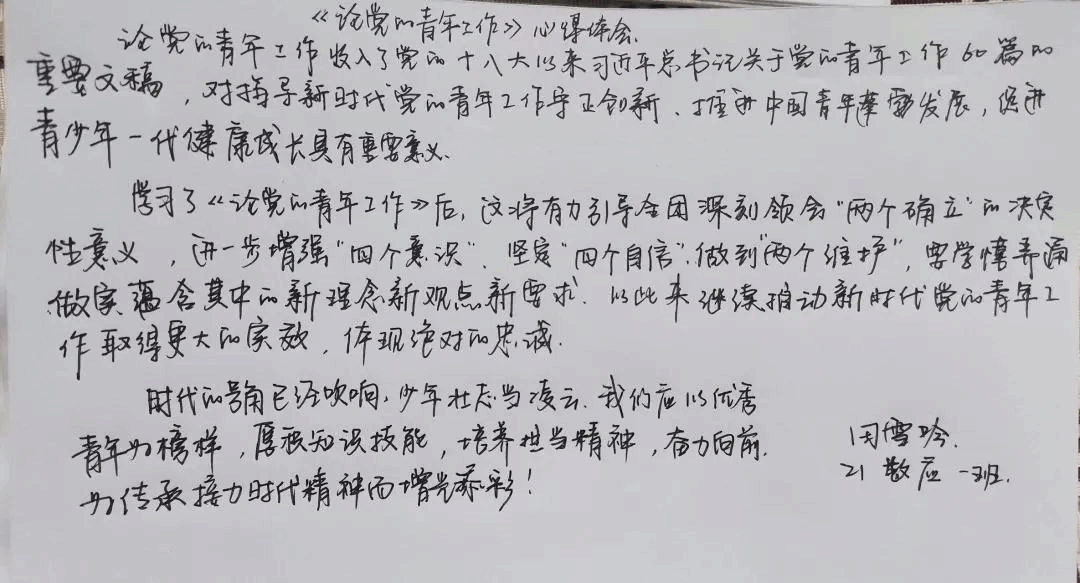 此次组织化地学习《论党的青年工作》理学院各班级的团支部干部们更应该认真思考、努力作为。在深化团学组织改革的大背景下,应该顺势而为积极作为, 努力为青年学生成长成才发展服务, 充分发挥在思想引领、服务同学、桥梁纽带方面的作用, 切实在新时代新征程上展现出新青年的责任与担当。