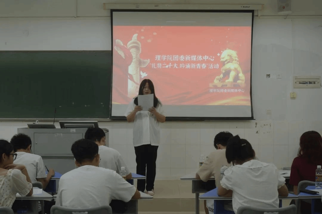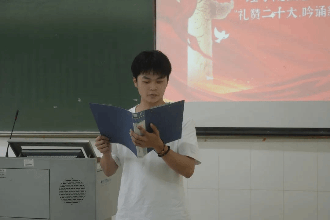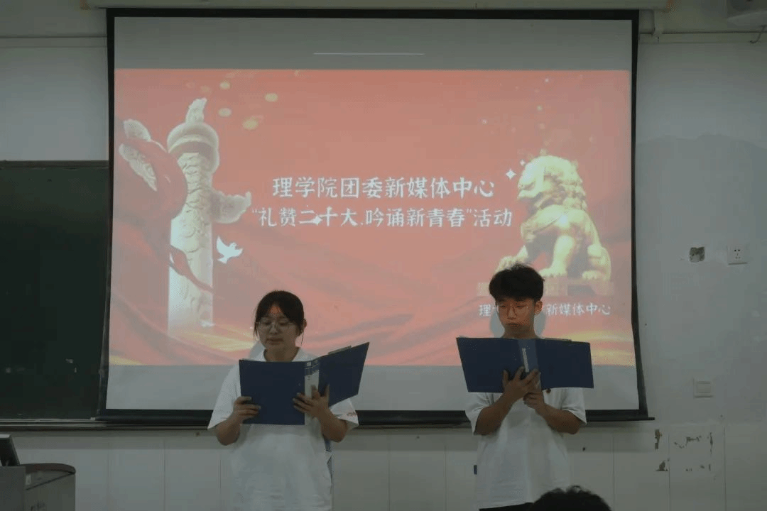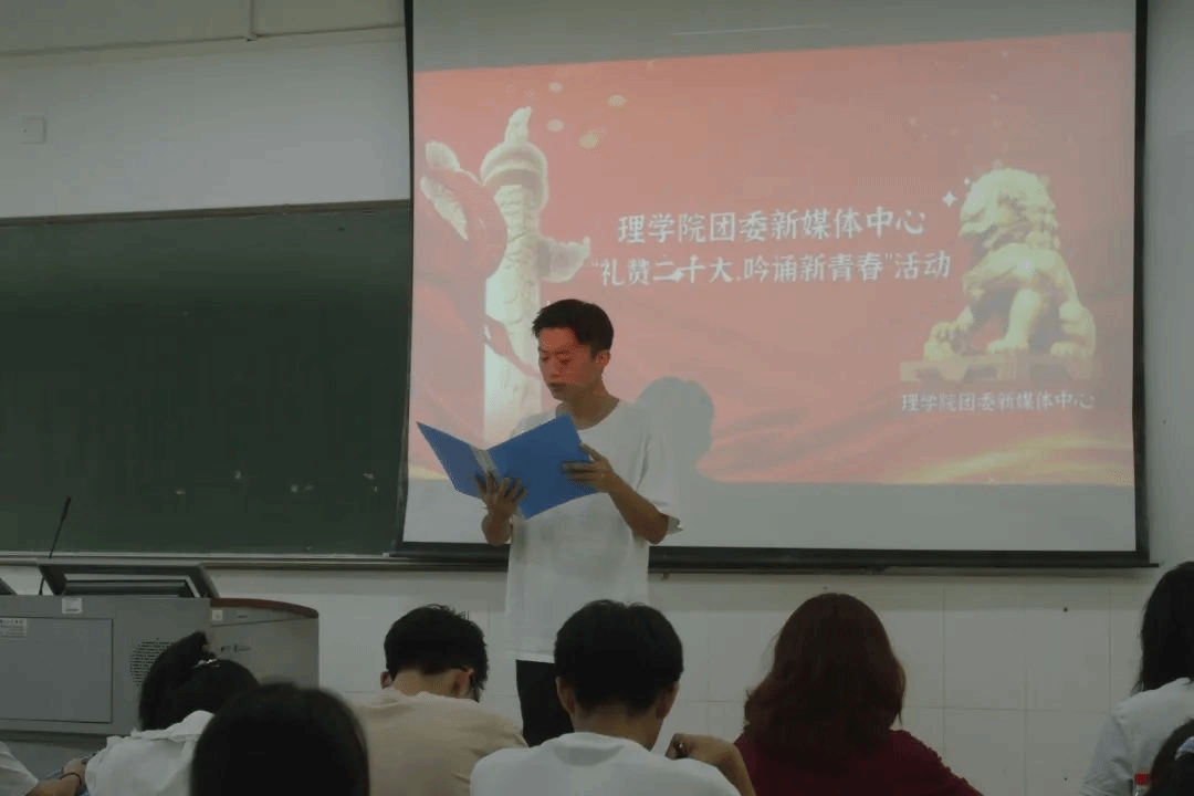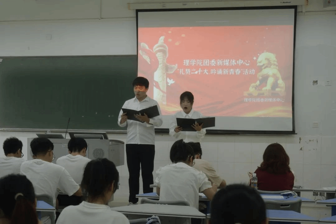 2023年5月23日下午,理学院团委新媒体中心在实B403开展以“礼赞二十大,吟诵新青春”为主题的朗诵活动。读千古美文与经典相伴,诵中华经典与圣贤同行。本次朗诵比赛共有来自理学院的18组选手参加。在主持人热情洋溢的开场下,比赛正式开始。