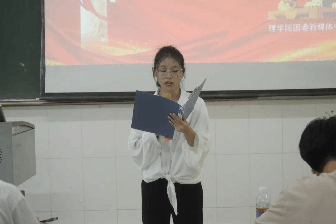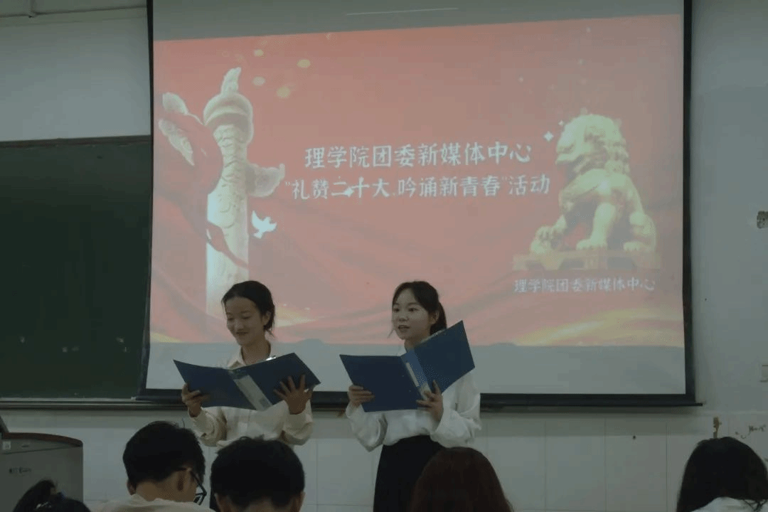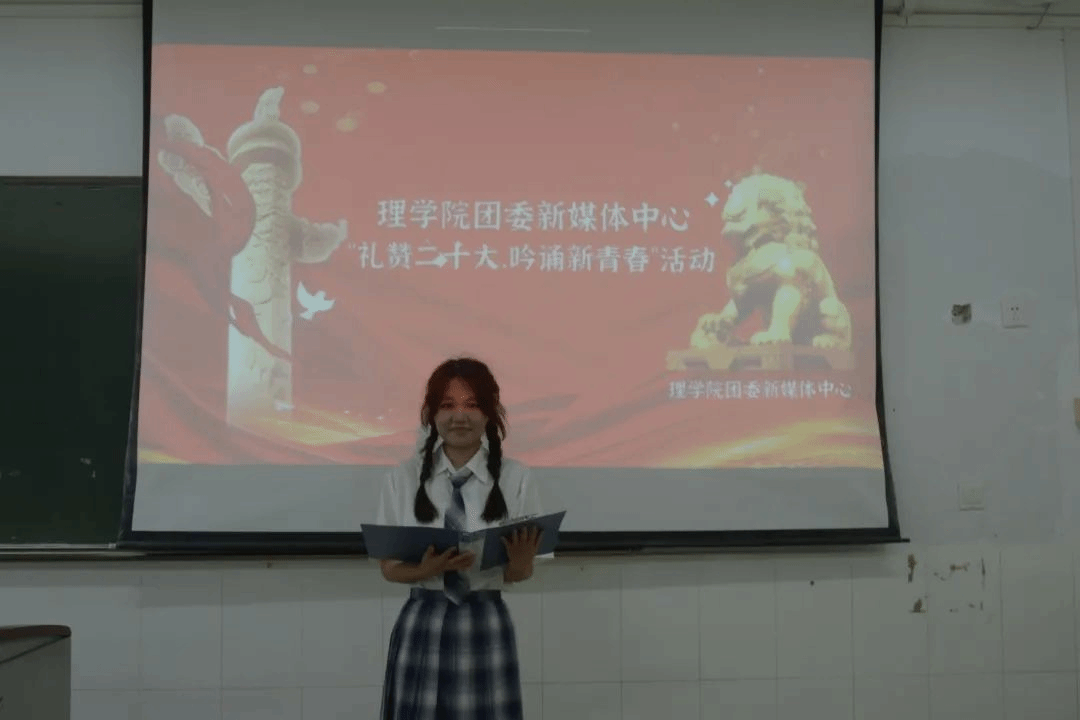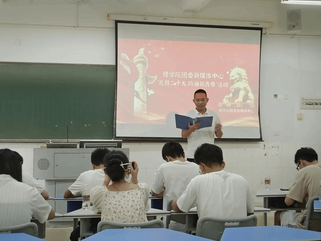 2023年5月23日下午,理学院团委新媒体中心在实B403开展以“礼赞二十大,吟诵新青春”为主题的朗诵活动。读千古美文与经典相伴,诵中华经典与圣贤同行。本次朗诵比赛共有来自理学院的18组选手参加。在主持人热情洋溢的开场下,比赛正式开始。