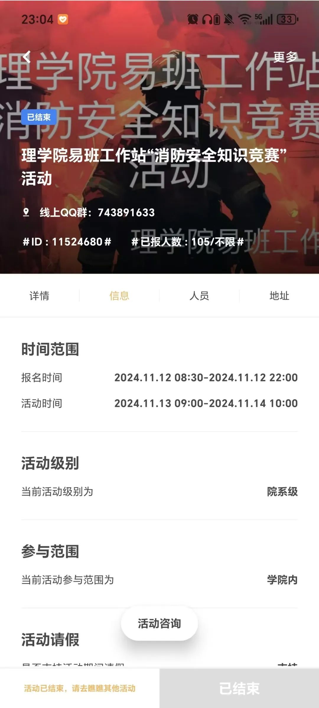 为了提升学生消防安全意识,普及消防安全知识。2024年11月13日理学院易班工作站精心组织的“消防安全知识竞赛”圆满落下帷幕。这一活动犹如一颗火种,点燃了广大学生对消防安全知识的热情,在校园中掀起了一股关注消防安全的热潮。