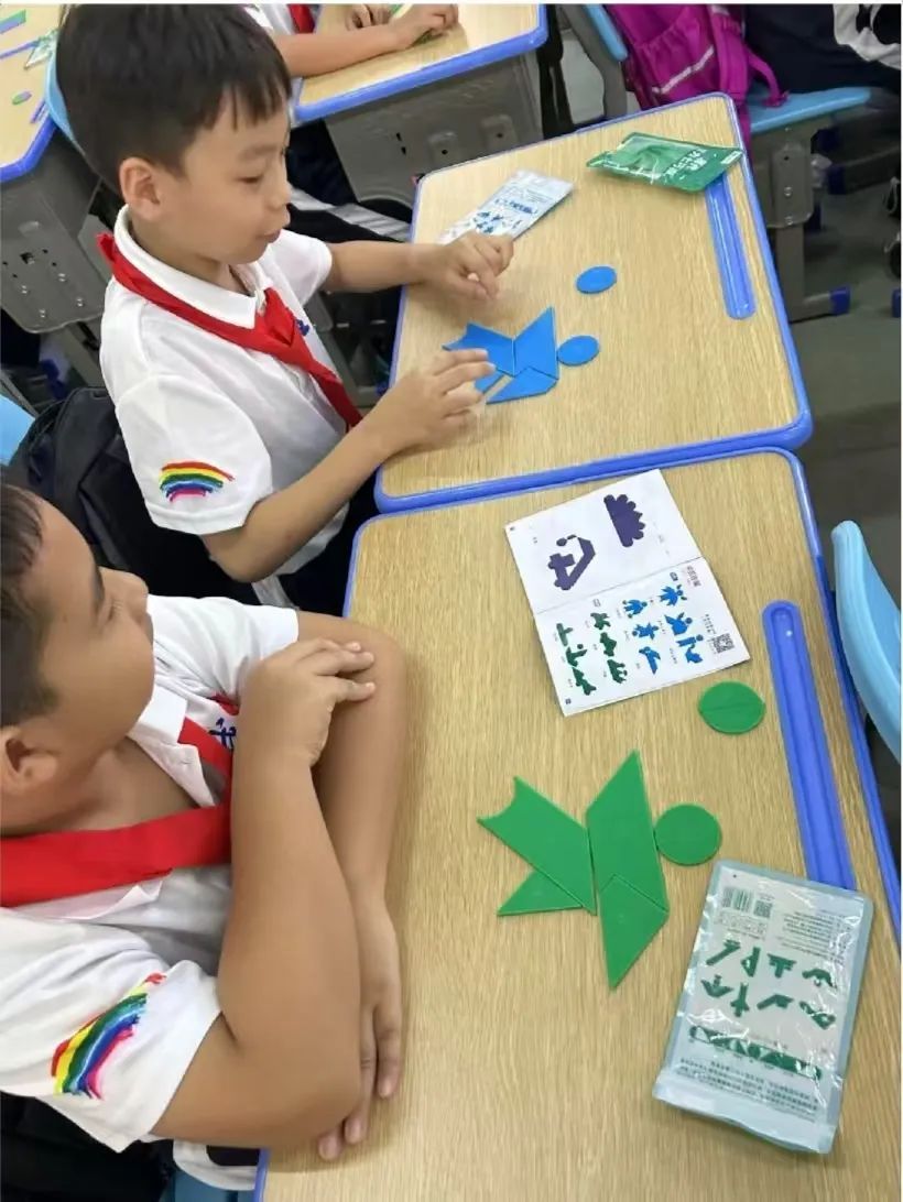 四年级的课堂中,在汪尊翰老师的指导下,学生们不断思考如何将不同的板块组合在一起,这锻炼了他们的逻辑推理和问题解决能力。不仅如此,七巧板可以拼出无数种图案,学生可以在掌握基本技巧后,自由创造新的图形,这极大地激发了学生的创造力。最重要的是拼图过程中可能会遇到困难,学生们耐心尝试不同的组合,直到找到正确的拼法,展现出了他们充分的耐心和毅力。