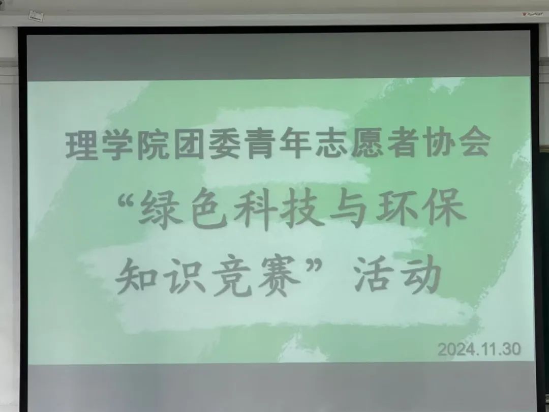 在当今全球环境问题日益凸显的时代背景下,理学院团委青年志愿者协会于2024年11月30日10:00—11:00在实b206筹备了此次绿色科技与环保知识竞赛活动。本次活动主题紧扣“绿韵悠扬,环保同行”,旨在通过竞赛这种既有趣味又充满挑战的形式,激发大众对绿色科技的探索热情,增强环保意识。活动聚焦于绿色科技领域中那些与日常生活息息相关的知识,比如节能减排的妙招、垃圾分类的科学依据、可再生能源的利用方式等。同学们在参与竞赛的过程中,深入了解环保的重要性以及绿色科技为守护地球家园所发挥的巨大作用。理学院团委青年志愿者协会希望借此次活动主题,吸引更多人加入环保行列,让绿色科技知识如悠扬的旋律,传遍每一个角落,引导大家在生活中真正与环保同行,共同为打造天蓝、地绿、水清的美丽世界贡献力量,开启绿色生活新篇章。
