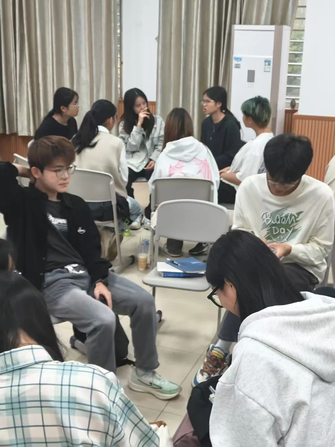 活动结束后,同学们回到集合点,围坐在一起,分享自己在漫步过程中印象最深刻的景色、内心的感受与体会,交流对校园自然之美的新感悟。同学们通过相互交流分享心得体会,增进了彼此之间的交流沟通,建立了更深厚的情谊。