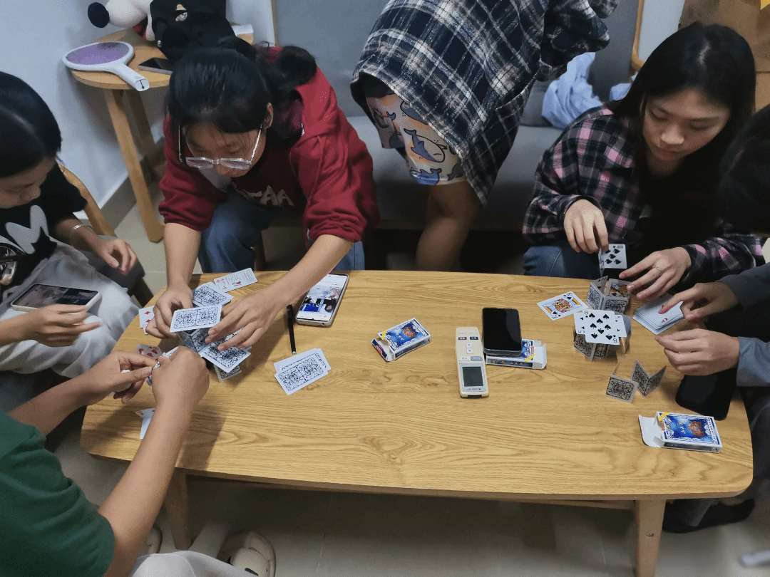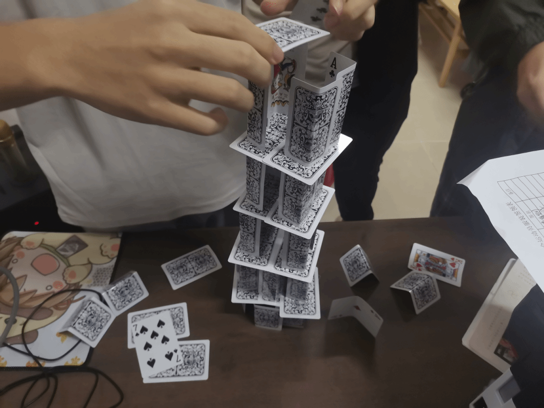 一副纸牌限时搭建,要求保持10秒以上,越高越好,不考虑外观,不符合要求则挑战失败,有效锻炼了团队协作与动手能力。游戏结束后,成员们围坐交流,有人复盘在游戏中遇到的困难,有人感慨团队协作的力量,有人分享沟通协调的经验。这次经历让大家在磨合中更加信任彼此,情谊愈发深厚。