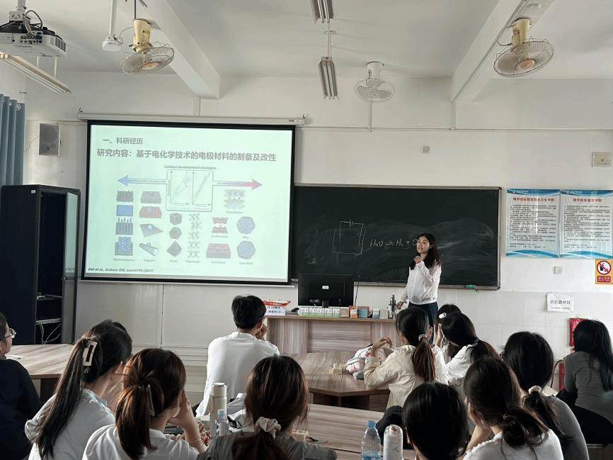 在讲座过程中,张老师还分享了自己在研究过程中的宝贵经验与难忘故事,让同学们深刻感受到科研探索的艰辛与乐趣。互动环节中,同学们踊跃提问,从纳米材料的制备工艺细节,到电分解水技术的大规模应用挑战,思维的火花在热烈的讨论中不断绽放,现场气氛十分活跃。